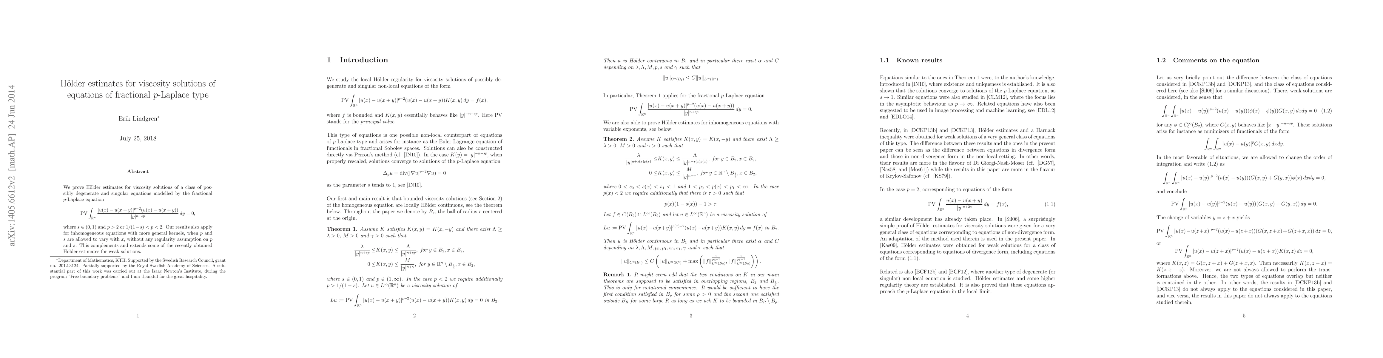 The paper proves Hölder estimates for viscosity solutions of equations modeled by the fractional p-Laplace operator, extending previous results to more general kernels and allowing p and s to vary with x.