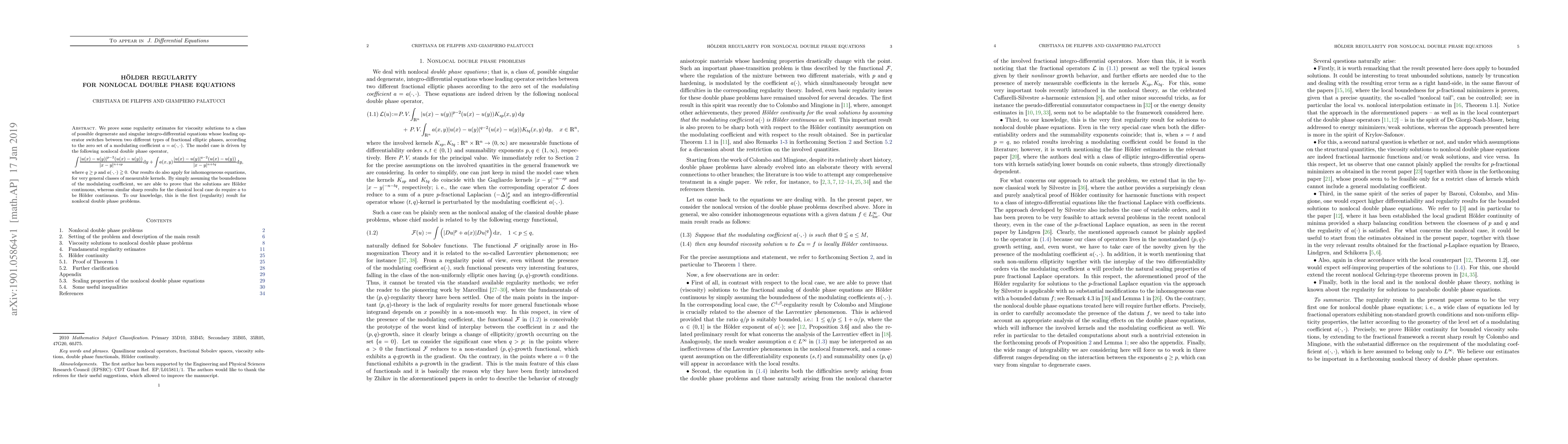 We prove some regularity estimates for viscosity solutions to a class of possible degenerate and singular integro-differential equations whose leading operator switches between two different types of fractional elliptic phases, according to the zero set of a modulating coefficient $a=a(\cdot,\cdot)$. The model case is driven by the following nonlocal double phase operator, $$ \int \!\frac{|u(x)-u(y)|^{p-2}(u(x)-u(y))}{|x-y|^{n+sp}}\, {\rm d}y + \int \!a(x,y)\frac{|u(x)-u(y)|^{q-2}(u(x)-u(y))}{|x-y|^{n+tq}}\, {\rm d}y, $$ where $q\geq p$ and $a(\cdot,\cdot)\geqq 0$. Our results do also apply for inhomogeneous equations, for very general classes of measurable kernels. By simply assuming the boundedness of the modulating coefficient, we are able to prove that the solutions are H\"older continuous, whereas similar sharp results for the classical local case do require $a$ to be H\"older continuous. To our knowledge, this is the first (regularity) result for nonlocal double phase problems.