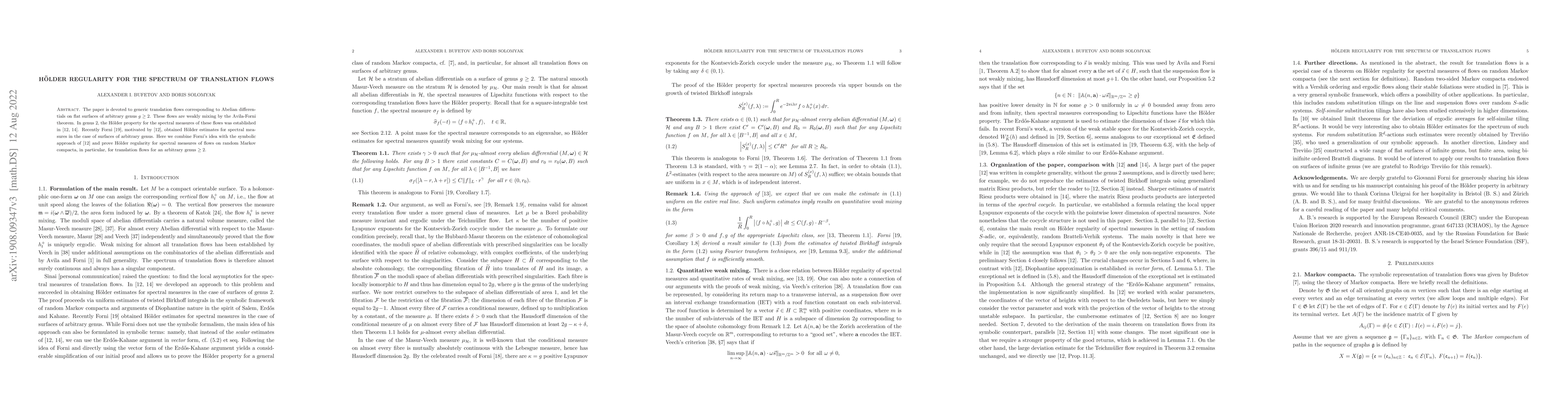 The paper is devoted to generic translation flows corresponding to Abelian differentials on flat surfaces of arbitrary genus $g\ge 2$. These flows are weakly mixing by the Avila-Forni theorem. In genus 2, the H\"older property for the spectral measures of these flows was established in our papers [10,12]. Recently Forni [17], motivated by [10], obtained H\"older estimates for spectral measures in the case of surfaces of arbitrary genus. Here we combine Forni's idea with the symbolic approach of [10] and prove H\"older regularity for spectral measures of flows on random Markov compacta, in particular, for translation flows in all genera.
