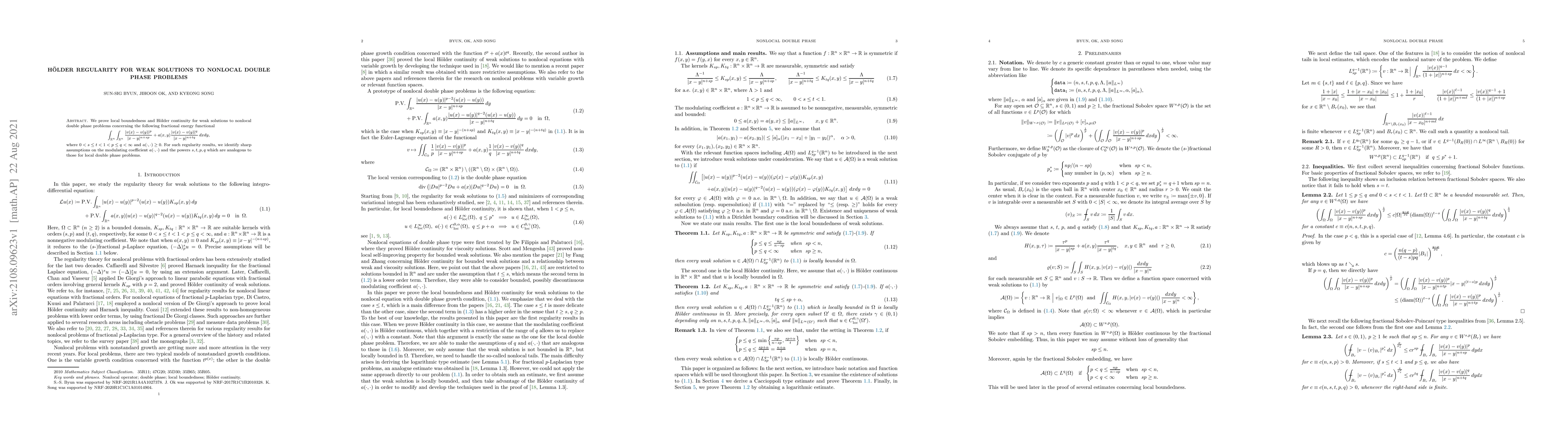 This paper proves local boundedness and H\"older continuity for weak solutions to nonlocal double phase problems, establishing sharp conditions on the modulating coefficient and the exponents involved. The focus is on the fractional energy functional with specific constraints on the parameters.