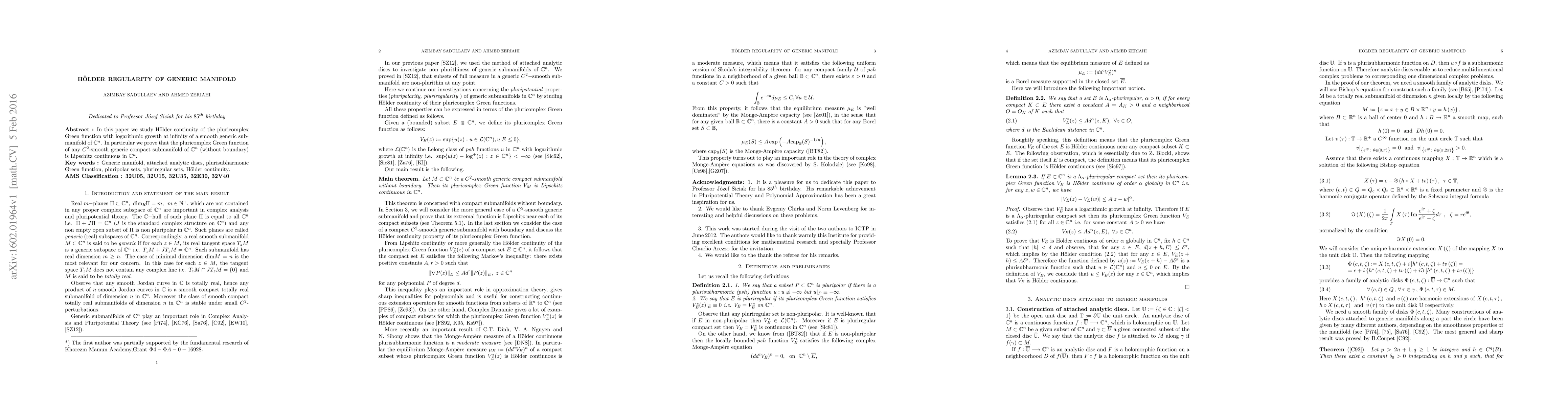 This paper explores the H\"older continuity of the pluricomplex Green function on smooth generic submanifolds of $\C^n$, proving that it exhibits Lipschitz continuity for $C^2$-smooth compact submanifolds without boundary.