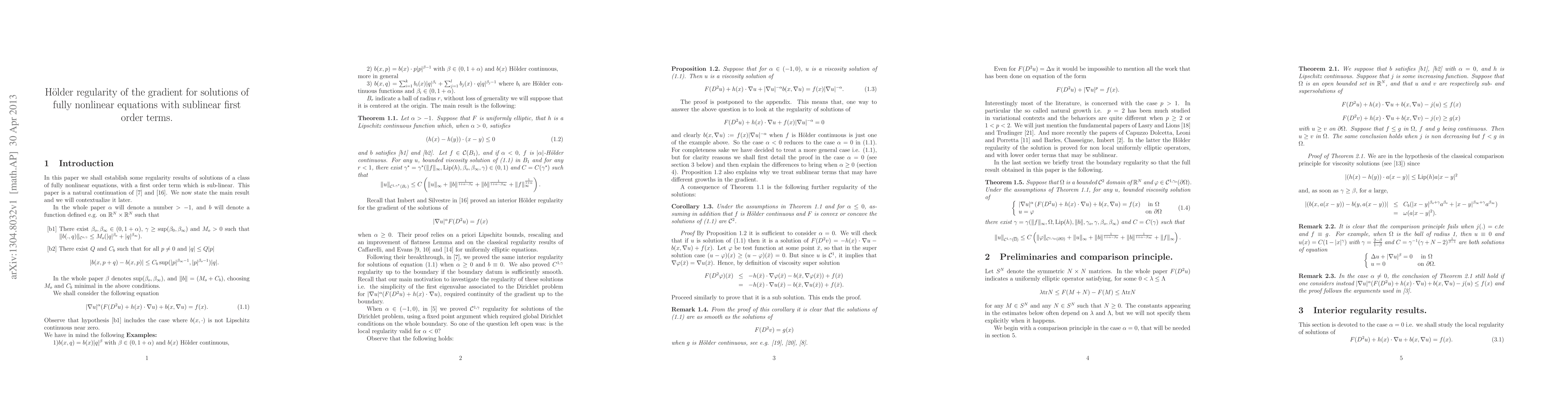 In this paper we shall establish some regularity results of solutions of a class of fully nonlinear equations, with a first order term which is sub-linear. We prove local H\"older regularity of the gradient both in the interior and up to the boundary.