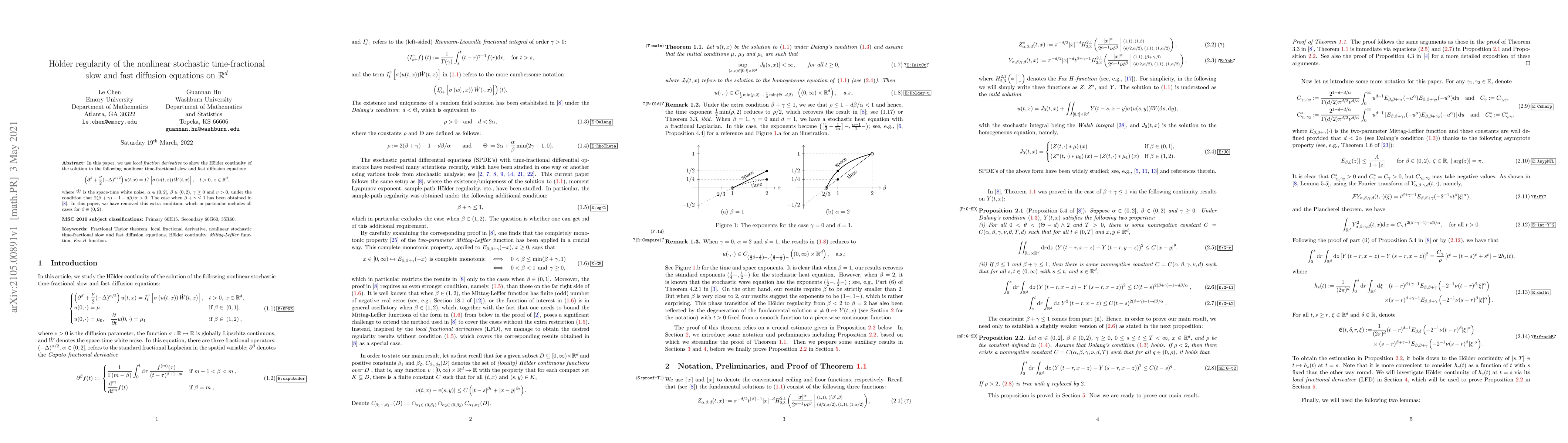 This paper demonstrates H\"older continuity of solutions to nonlinear time-fractional slow and fast diffusion equations using local fractional derivatives, removing previous restrictive conditions and thus covering a broader range of parameters. The focus is on the equation involving a space-time white noise term.