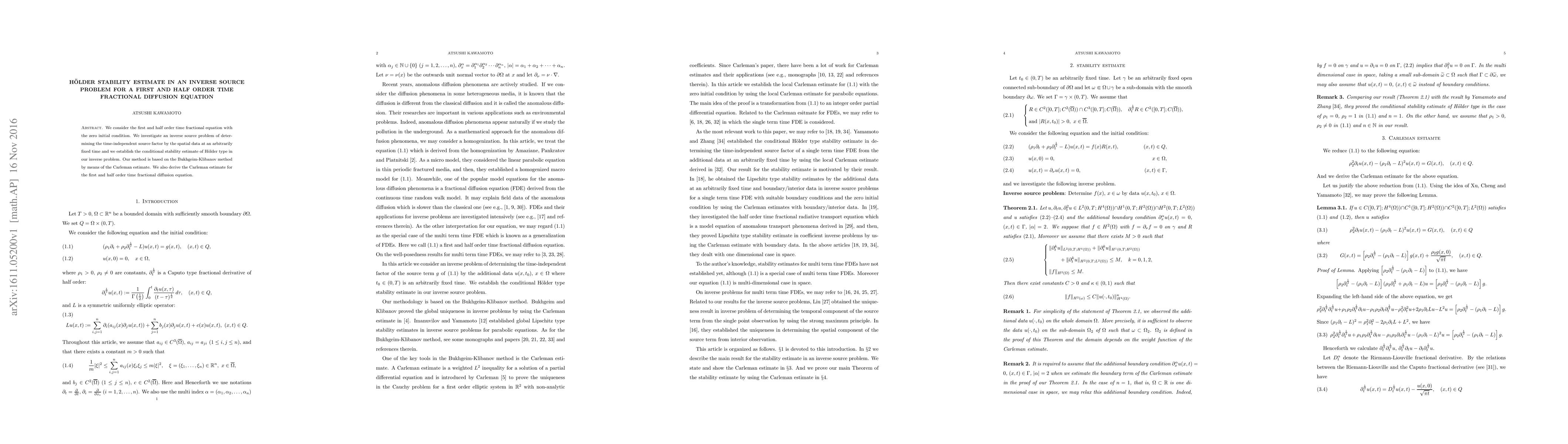 This paper investigates an inverse source problem for a first and half order time fractional diffusion equation, establishing a conditional H\"older stability estimate using the Bukhgeim-Klibanov method and a derived Carleman estimate. The method leverages data at a fixed time to determine the time-independent source factor.