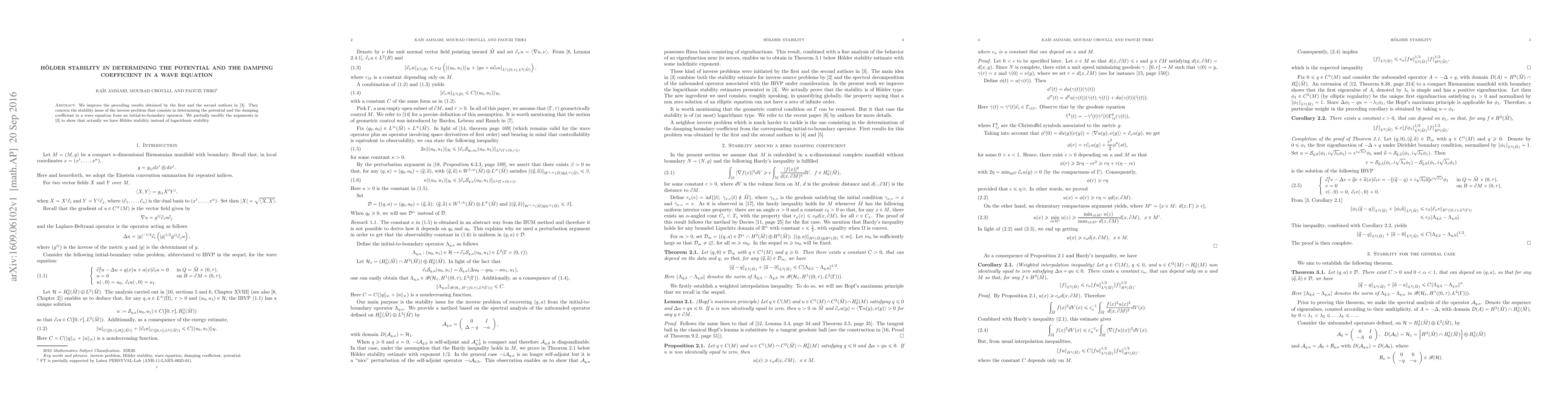 Summary: This paper enhances previous results on the stability of inverse problems in wave equations, demonstrating that the potential and damping coefficients can be determined with Hölder stability rather than logarithmic stability, improving upon earlier findings.