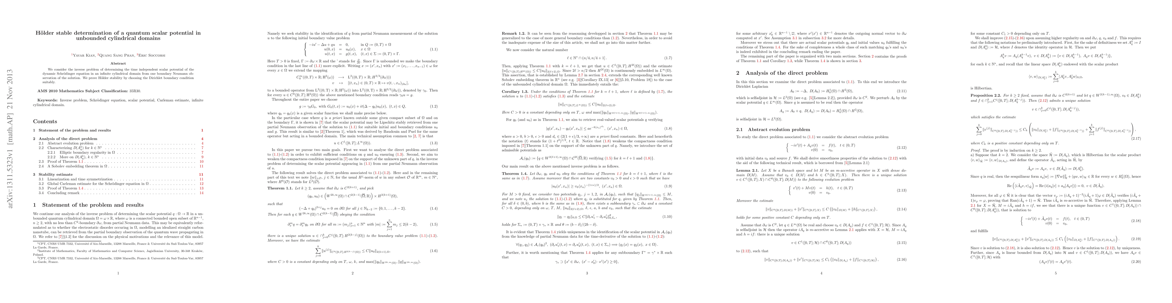 Researchers developed a method to determine a quantum scalar potential in an infinite cylindrical domain based on one boundary observation, proving H"older stability with suitable Dirichlet boundary conditions.