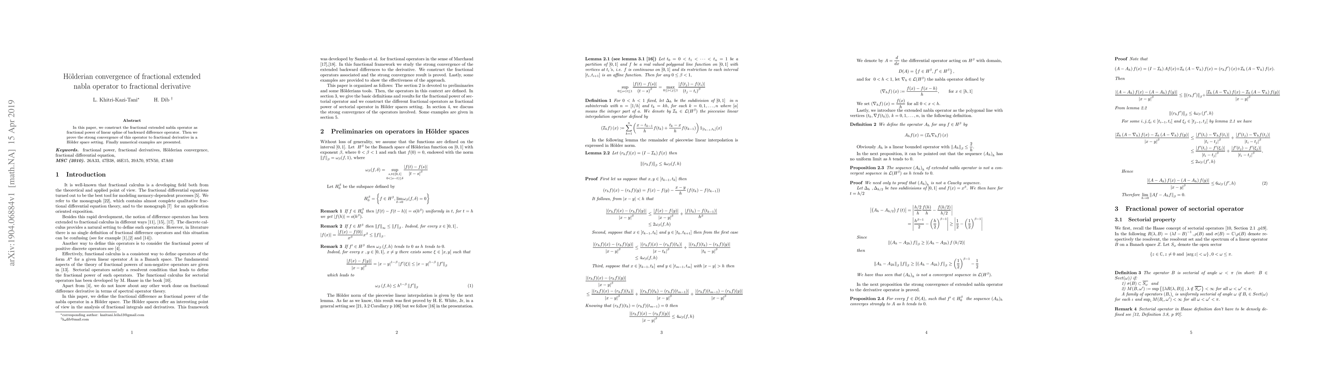 In this paper, we construct the fractional extended nabla operator as fractional power of linear spline of backward difference operator. Then we prove the strong convergence of this operator to fractional derivative in a H\"older space setting. Finally numerical examples are presented.