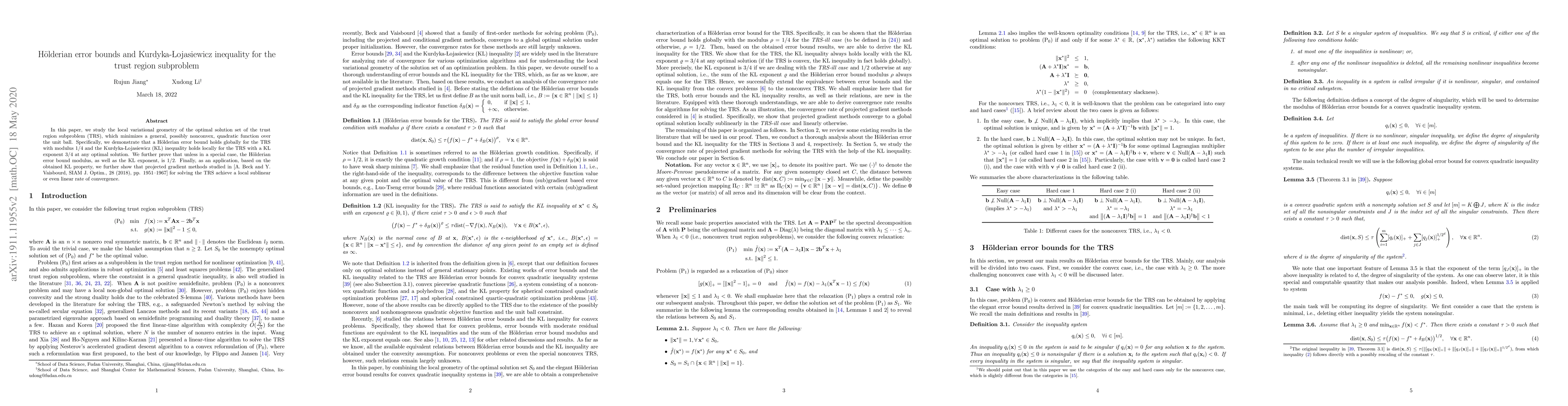 In this paper, we study the local variational geometry of the optimal solution set of the trust region subproblem (TRS), which minimizes a general, possibly nonconvex, quadratic function over the unit ball. Specifically, we demonstrate that a H\"olderian error bound holds globally for the TRS with modulus 1/4 and the Kurdyka-{\L}ojasiewicz (KL) inequality holds locally for the TRS with a KL exponent 3/4 at any optimal solution. We further prove that unless in a special case, the H\"olderian error bound modulus, as well as the KL exponent, is 1/2. Finally, based on the obtained KL property, we further show that the projected gradient methods studied in [A. Beck and Y. Vaisbourd, SIAM J. Optim., 28 (2018), pp. 1951--1967] for solving the TRS achieve a sublinear or even linear rate of convergence.
