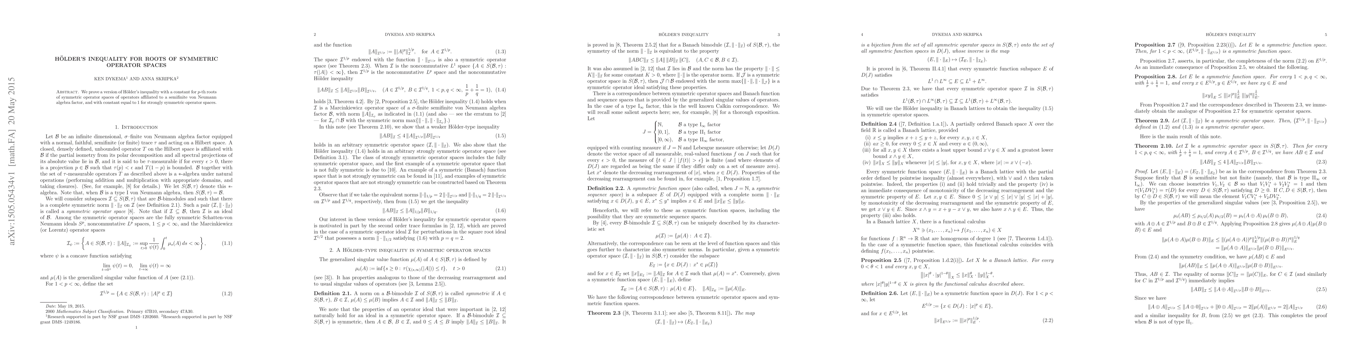 Summary: This paper establishes a Holder's inequality for p-th roots of symmetric operator spaces affiliated with semifinite von Neumann algebra factors, with a constant equal to 1 for strongly symmetric operator spaces. The result extends classical Holder's inequality to this operator-theoretic context.