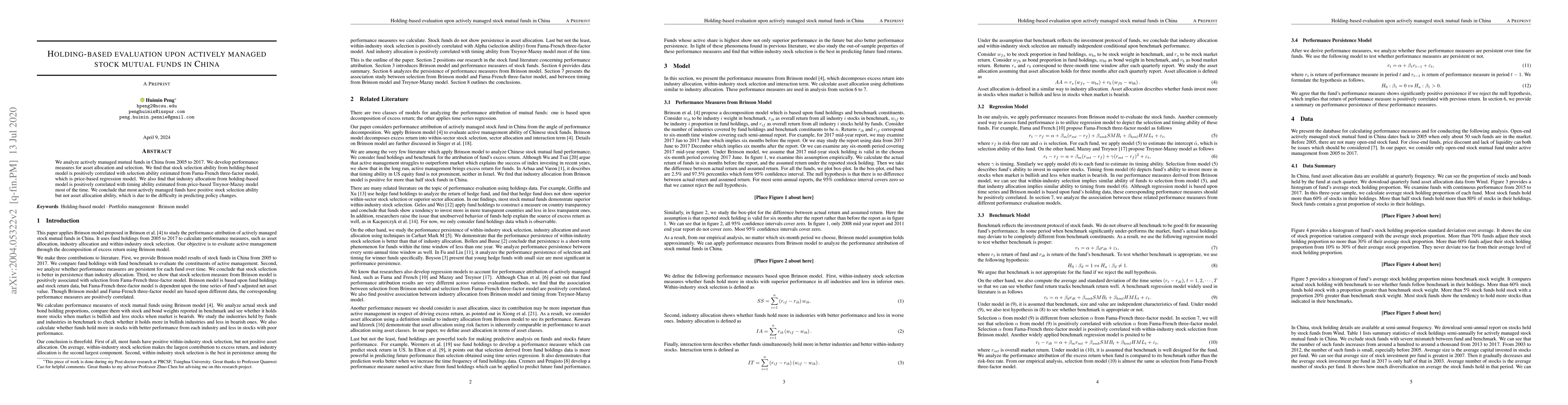 Summary: This study evaluates actively managed mutual funds in China from 2005 to 2017 using holding-based and price-based models. It finds positive correlations between stock selection and industry allocation abilities across different models, concluding that while funds show strong stock selection, they lack effective asset allocation due to challenges in predicting policy changes.