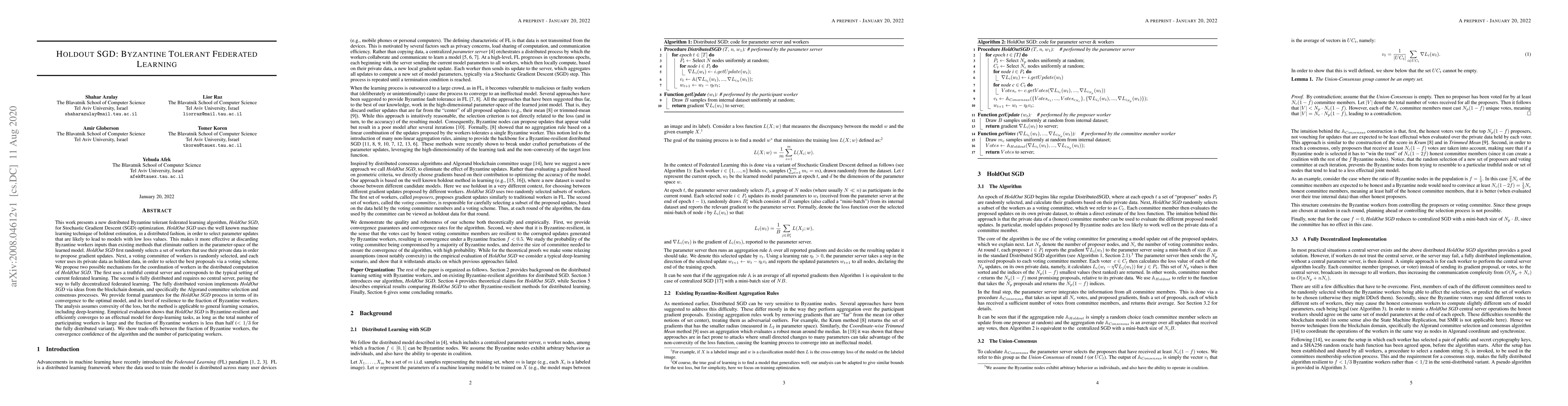 This work presents a new distributed Byzantine tolerant federated learning algorithm, HoldOut SGD, for Stochastic Gradient Descent (SGD) optimization. HoldOut SGD uses the well known machine learning technique of holdout estimation, in a distributed fashion, in order to select parameter updates that are likely to lead to models with low loss values. This makes it more effective at discarding Byzantine workers inputs than existing methods that eliminate outliers in the parameter-space of the learned model. HoldOut SGD first randomly selects a set of workers that use their private data in order to propose gradient updates. Next, a voting committee of workers is randomly selected, and each voter uses its private data as holdout data, in order to select the best proposals via a voting scheme. We propose two possible mechanisms for the coordination of workers in the distributed computation of HoldOut SGD. The first uses a truthful central server and corresponds to the typical setting of current federated learning. The second is fully distributed and requires no central server, paving the way to fully decentralized federated learning. The fully distributed version implements HoldOut SGD via ideas from the blockchain domain, and specifically the Algorand committee selection and consensus processes. We provide formal guarantees for the HoldOut SGD process in terms of its convergence to the optimal model, and its level of resilience to the fraction of Byzantine workers. Empirical evaluation shows that HoldOut SGD is Byzantine-resilient and efficiently converges to an effectual model for deep-learning tasks, as long as the total number of participating workers is large and the fraction of Byzantine workers is less than half (<1/3 for the fully distributed variant).