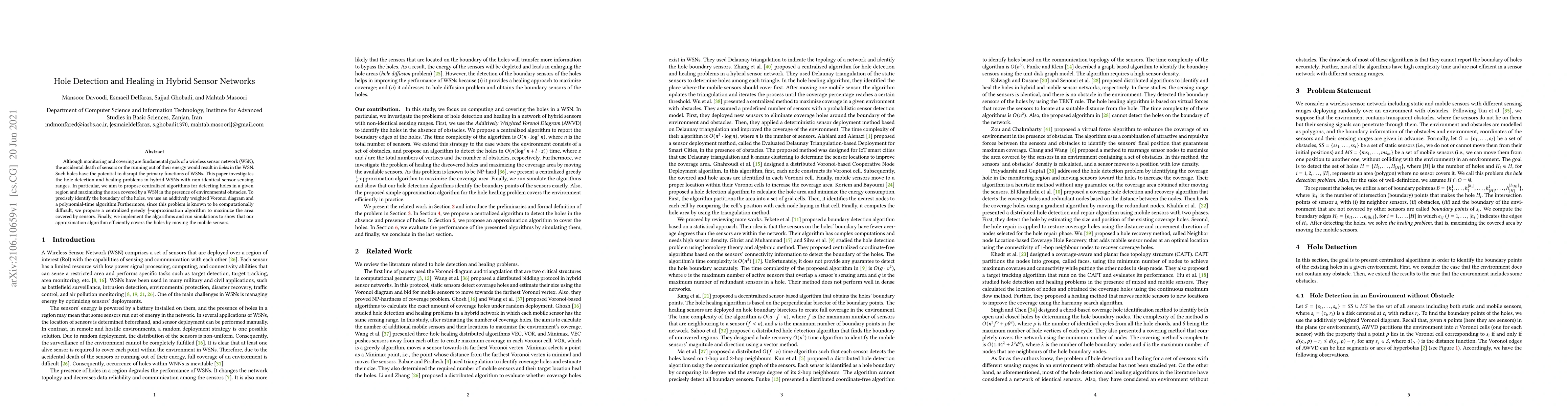 Although monitoring and covering are fundamental goals of a wireless sensor network (WSN), the accidental death of sensors or the running out of their energy would result in holes in the WSN. Such holes have the potential to disrupt the primary functions of WSNs. This paper investigates the hole detection and healing problems in hybrid WSNs with non-identical sensor sensing ranges. In particular, we aim to propose centralized algorithms for detecting holes in a given region and maximizing the area covered by a WSN in the presence of environmental obstacles. To precisely identify the boundary of the holes, we use an additively weighted Voronoi diagram and a polynomial-time algorithm.Furthermore, since this problem is known to be computationally difficult, we propose a centralized greedy 1/2-approximation algorithm to maximize the area covered by sensors. Finally, we implement the algorithms and run simulations to show that our approximation algorithm efficiently covers the holes by moving the mobile sensors.