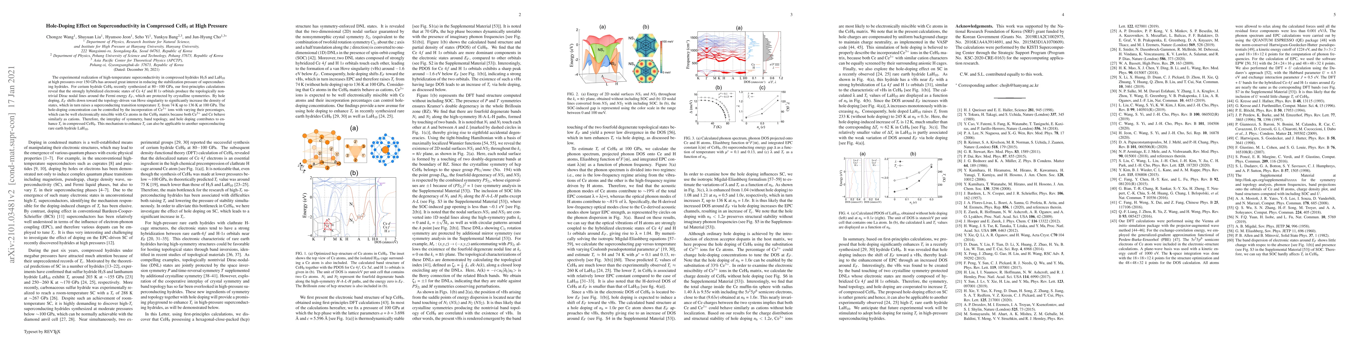 The experimental realization of high-temperature superconductivity in compressed hydrides H$_3$S and LaH$_{10}$ at high pressures over 150 GPa has aroused great interest in reducing the stabilization pressure of superconducting hydrides. For cerium hydride CeH$_9$ recently synthesized at 80$-$100 GPa, our first-principles calculations reveal that the strongly hybridized electronic states of Ce 4$f$ and H 1$s$ orbitals produce the topologically nontrivial Dirac nodal lines around the Fermi energy $E_F$, which are protected by crystalline symmetries. By hole doping, $E_F$ shifts down toward the topology-driven van Hove singularity to significantly increase the density of states, which in turn raises a superconducting transition temperature $T_c$ from 74 K up to 136 K at 100 GPa. The hole-doping concentration can be controlled by the incorporation of Ce$^{3+}$ ions with varying their percentages, which can be well electronically miscible with Ce atoms in the CeH$_9$ matrix because both Ce$^{3+}$ and Ce behave similarly as cations. Therefore, the interplay of symmetry, band topology, and hole doping contributes to enhance $T_c$ in compressed CeH$_9$. This mechanism to enhance $T_c$ can also be applicable to another superconducting rare earth hydride LaH$_{10}$.