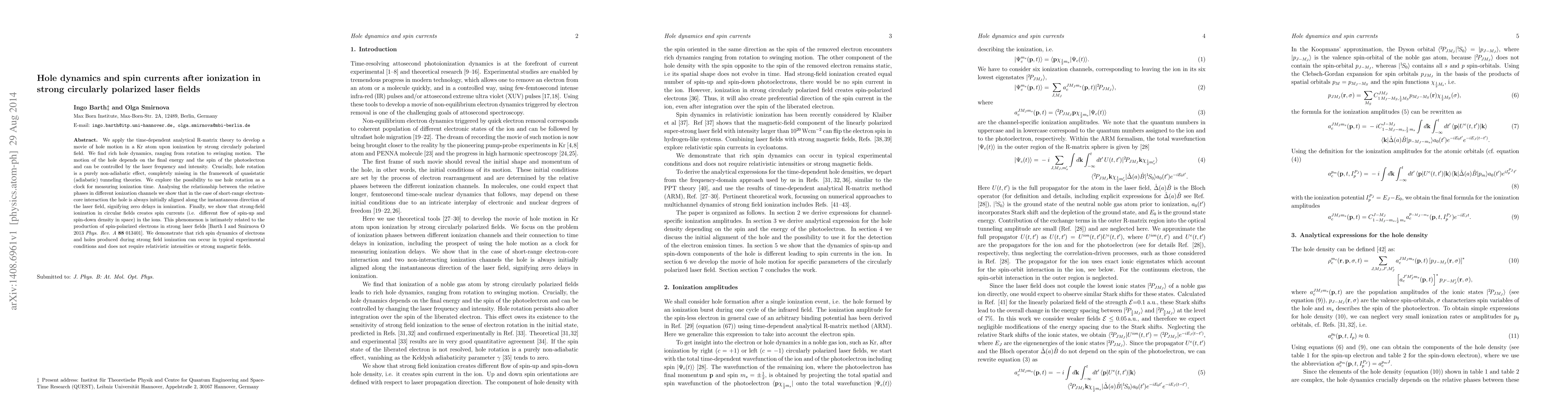 We apply the time-dependent analytical R-matrix theory to develop a movie of hole motion in a Kr atom upon ionization by strong circularly polarized field. We find rich hole dynamics, ranging from rotation to swinging motion. The motion of the hole depends on the final energy and the spin of the photoelectron and can be controlled by the laser frequency and intensity. Crucially, hole rotation is a purely non-adiabatic effect, completely missing in the framework of quasistatic (adiabatic) tunneling theories. We explore the possibility to use hole rotation as a clock for measuring ionization time. Analysing the relationship between the relative phases in different ionization channels we show that in the case of short-range electron-core interaction the hole is always initially aligned along the instantaneous direction of the laser field, signifying zero delays in ionization. Finally, we show that strong-field ionization in circular fields creates spin currents (i.e. different flow of spin-up and spin-down density in space) in the ions. This phenomenon is intimately related to the production of spin-polarized electrons in strong laser fields [Barth I and Smirnova O 2013 Phys. Rev. A 88 013401]. We demonstrate that rich spin dynamics of electrons and holes produced during strong field ionization can occur in typical experimental conditions and does not require relativistic intensities or strong magnetic fields.