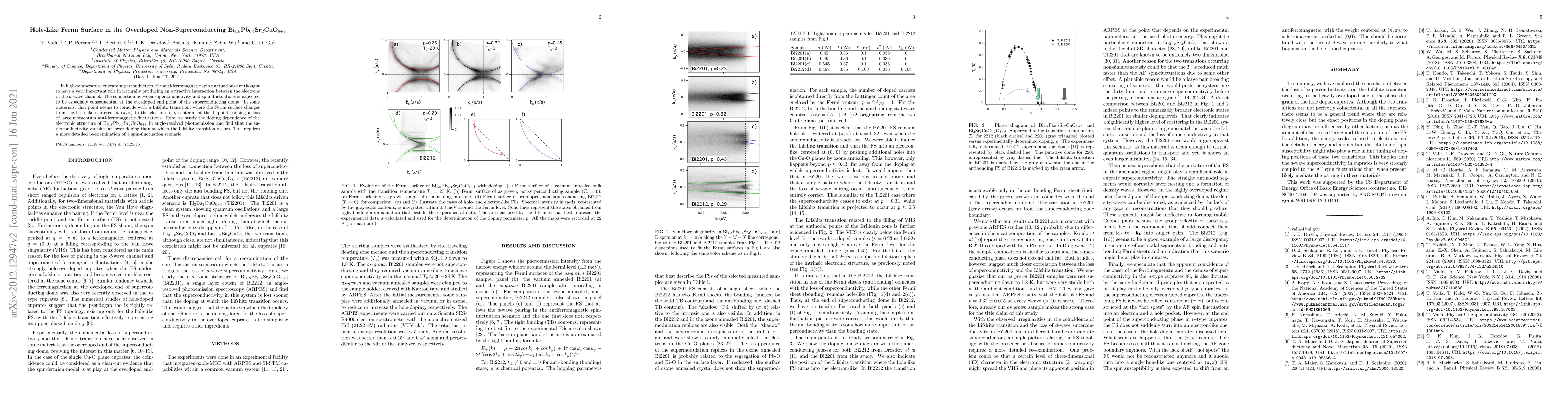 This study reveals that in the overdoped non-superconducting Bi$_{1.8}$Pb$_{0.4}$Sr$_2$CuO$_{6+\delta}$, the Fermi surface retains a hole-like shape, despite superconductivity vanishing at lower doping levels than the Lifshitz transition. This challenges the spin-fluctuation theory linking superconductivity and Fermi surface topology.