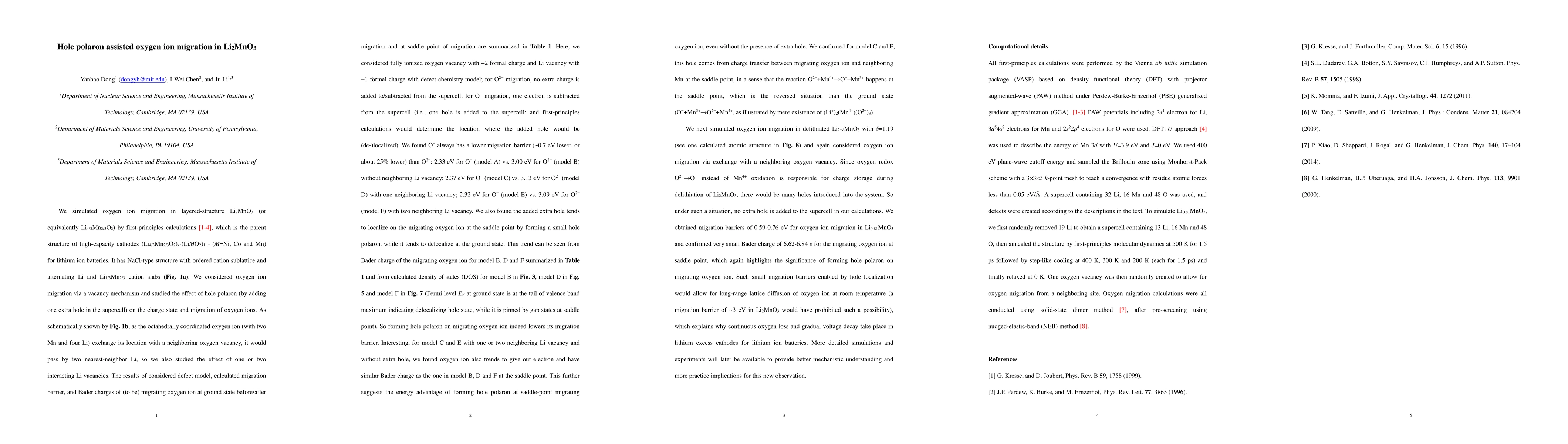 A first-principles calculation study found that hole polaron assistance lowers oxygen ion migration barriers in Li2MnO3, a promising approach for improving cathode performance in lithium-ion batteries.