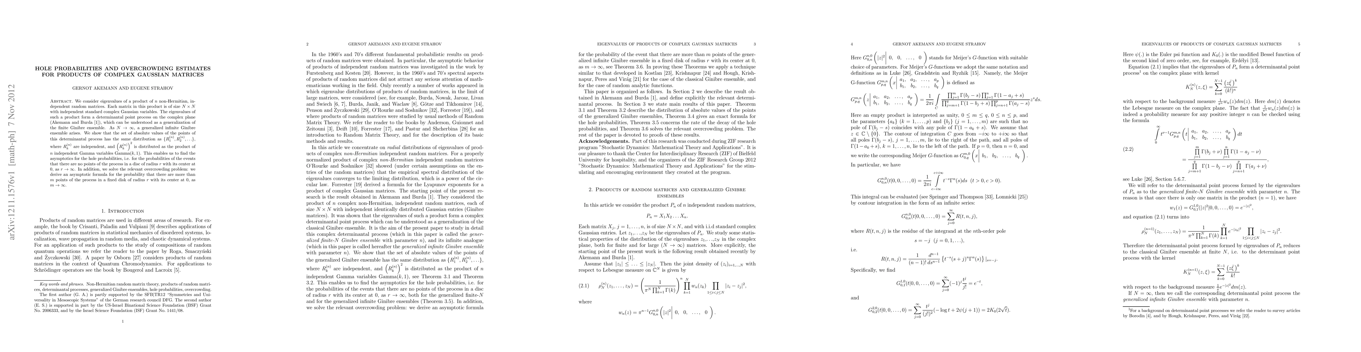 This paper studies the eigenvalues of products of large non-Hermitian, independent random Gaussian matrices, showing they form a determinantal point process. It derives asymptotic expressions for hole probabilities and overcrowding estimates for this process as the matrix size and number of products tend to infinity.
