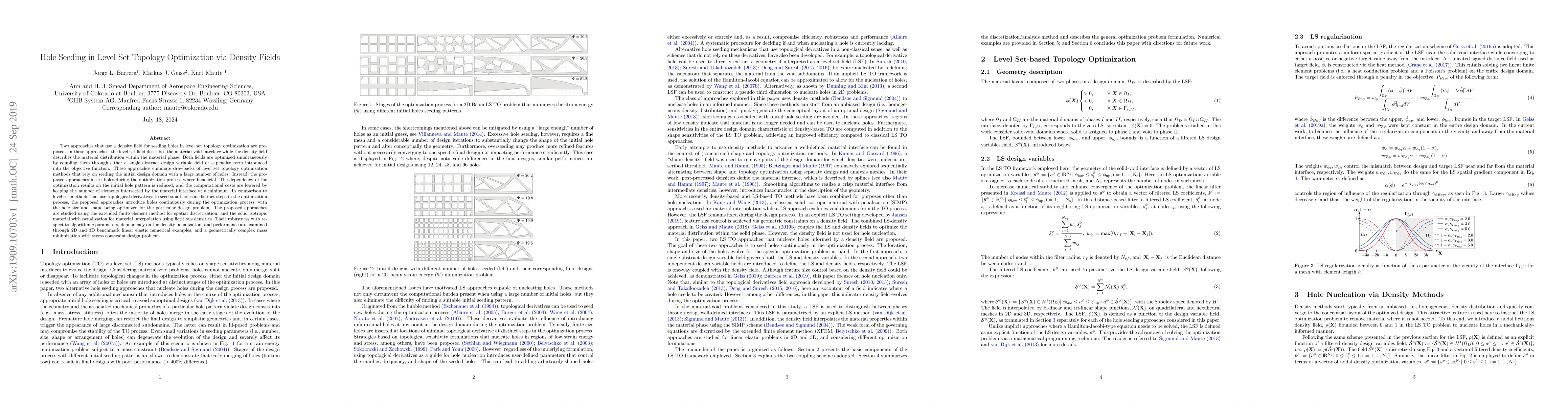 This paper proposes two density field-based methods for hole seeding in level set topology optimization, optimizing both the level set and density fields simultaneously to reduce initial design domain hole seeding and computational costs. The robustness and performance of these methods are validated through 2D and 3D benchmark problems and a complex mass minimization design task.