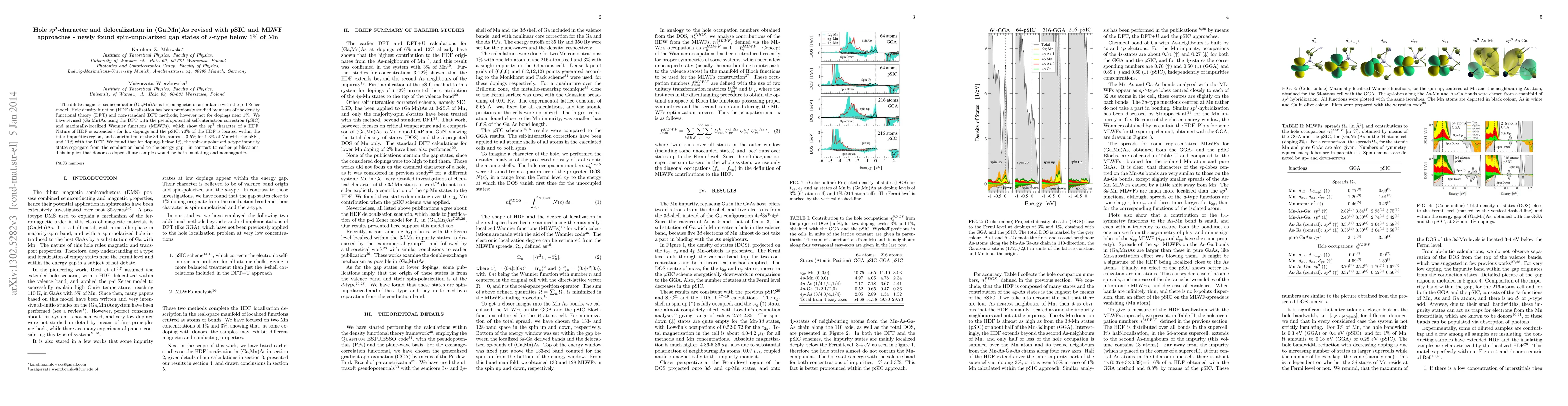 The dilute magnetic semiconductor (Ga,Mn)As is ferromagnetic in accordance with the p-d Zener model. Hole density function (HDF) localization has been previously studied by means of the density functional theory (DFT) and non-standard DFT methods; however not for dopings near 1%. We have revised (Ga,Mn)As using the DFT with the pseudopotential self-interaction correction (pSIC) and maximally-localized Wannier functions (MLWFs), which show the sp3 character of a HDF. Nature of HDF is extended - for low dopings and the pSIC, 70% of the HDF is located within the inter-impurities region, and contribution of the 3d-Mn states is 3-5% for 1-3% of Mn with the pSIC, and 11% with the DFT. We found that for dopings below 1%, the spin-unpolarized s-type impurity states segregate from the conduction band to the energy gap - in contrast to earlier publications. This implies that donor co-doped dilute samples would be both insulating and nonmagnetic.