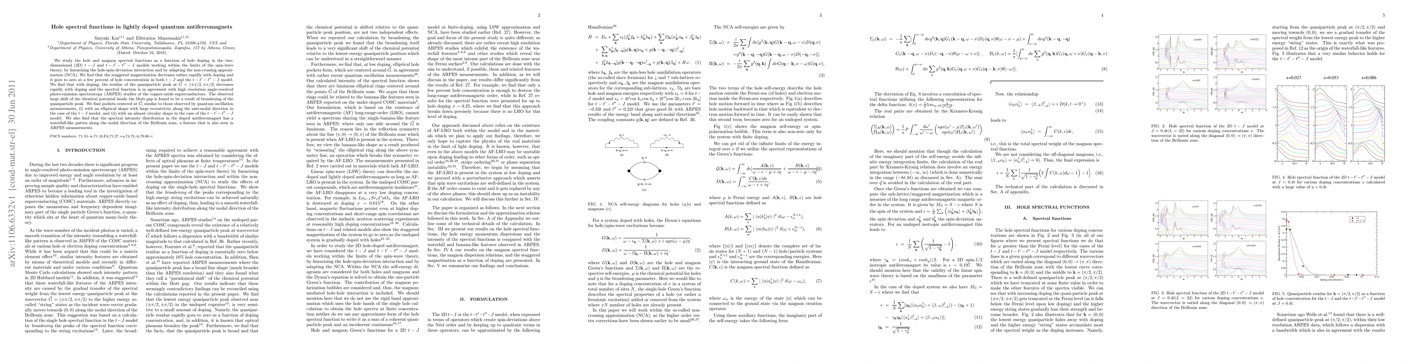 We study the hole and magnon spectral functions as a function of hole doping in the two-dimensional (2D) t-J and t-t'-t"-J models working within the limits of the spin-wave theory, by linearizing the hole-spin-deviation interaction and by adapting the non-crossing approximation (NCA). We find that the staggered magnetization decreases rather rapidly with doping and it goes to zero at a few percent of hole concentration in both t-J and the t-t'-t"-J model. We find that with doping, the residue of the quasiparticle peak at G=(pi/2,pi/2) decreases rapidly with doping and the spectral function is in agreement with high resolution angle-resolved photo-emission spectroscopy (ARPES) studies of the copper-oxide superconductors. The observed large shift of the chemical potential inside the Mott gap is found to be a result of broadening of the quasiparticle peak. We find pockets centered at G, similar to those observed by quantum oscillation measurements, (i) with an elliptical shape with large eccentricity along the anti-nodal direction in the case of the t-J model, and (ii) with an almost circular shape in the case of the t-t'-t"-J model. We also find that the spectral intensity distribution in the doped antiferromagnet has a waterfall-like patten along the nodal direction of the Brillouin zone, a feature that is also seen in ARPES measurements.