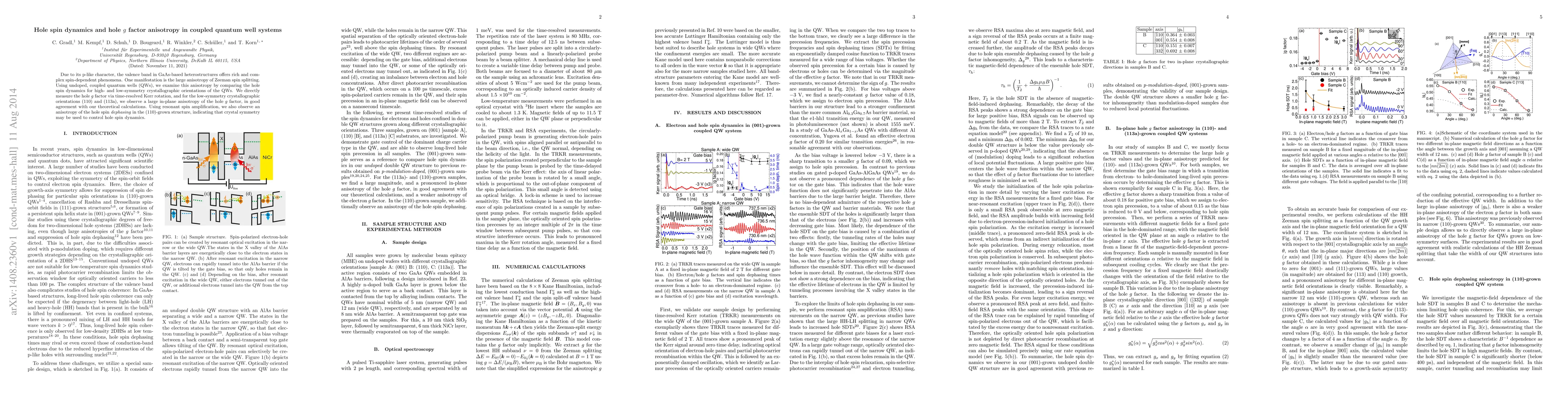 This paper investigates the spin dynamics and $g$ factor anisotropy of holes in coupled quantum wells (QWs) in GaAs-based heterostructures, revealing significant in-plane anisotropy for low-symmetry orientations (110) and (113a) via time-resolved Kerr rotation, and demonstrating control over hole spin dephasing through resonant spin amplification.