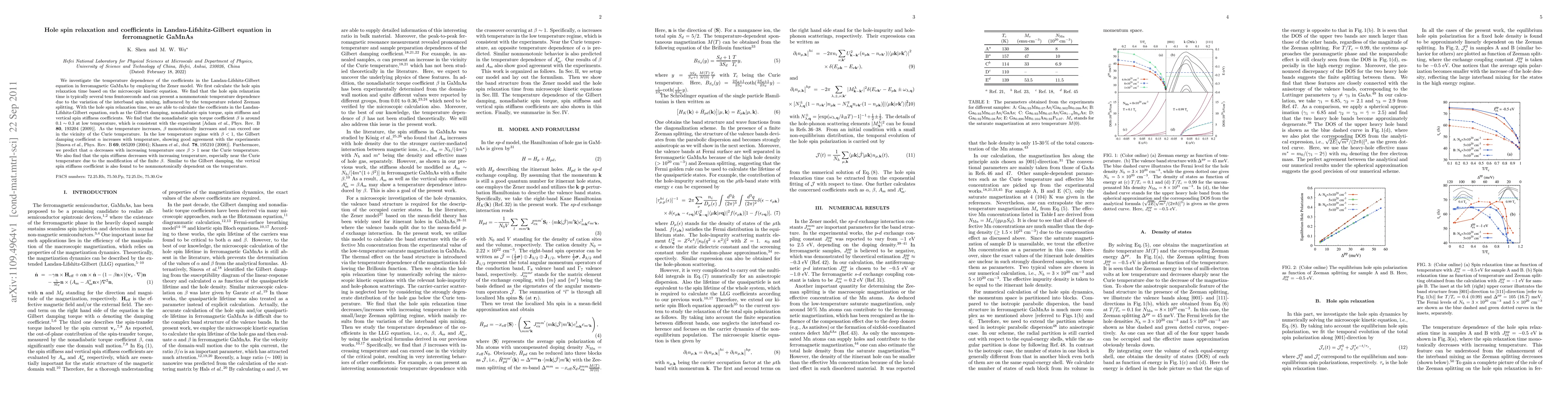 This paper investigates the temperature dependence of coefficients in the Landau-Lifshitz-Gilbert equation for ferromagnetic GaMnAs using the Zener model. It finds that the hole spin relaxation time varies nonmonotonically with temperature due to interband spin mixing, and the nonadiabatic spin torque coefficient $\beta$ increases with temperature, exceeding one near the Curie temperature.