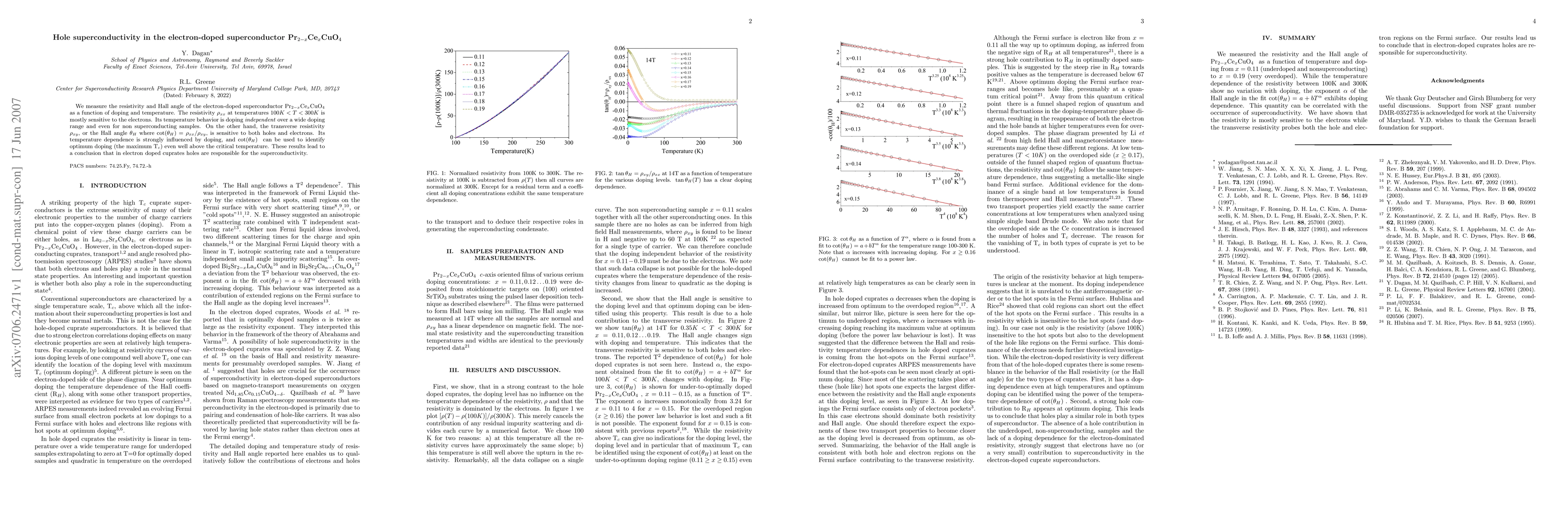 We measure the resistivity and Hall angle of the electron-doped superconductor Pr_{2-x}Ce_xCuO_4 as a function of doping and temperature. The resistivity Rho_xx at temperatures 100K < T < 300K is mostly sensitive to the electrons. Its temperature behavior is doping independent over a wide doping range and even for non superconducting samples. On the other hand,the transverse resistivity rho_xy, or the Hall angle theta_H where cot(theta_H) = rho_xx/rho_xy, is sensitive to both holes and electrons. Its temperature dependence is strongly influenced by doping, and cot(theta_H) can be used to identify optimum doping (the maximum Tc) even well above the critical temperature. These results lead to a conclusion that in electron doped cuprates holes are responsible for the superconductivity.