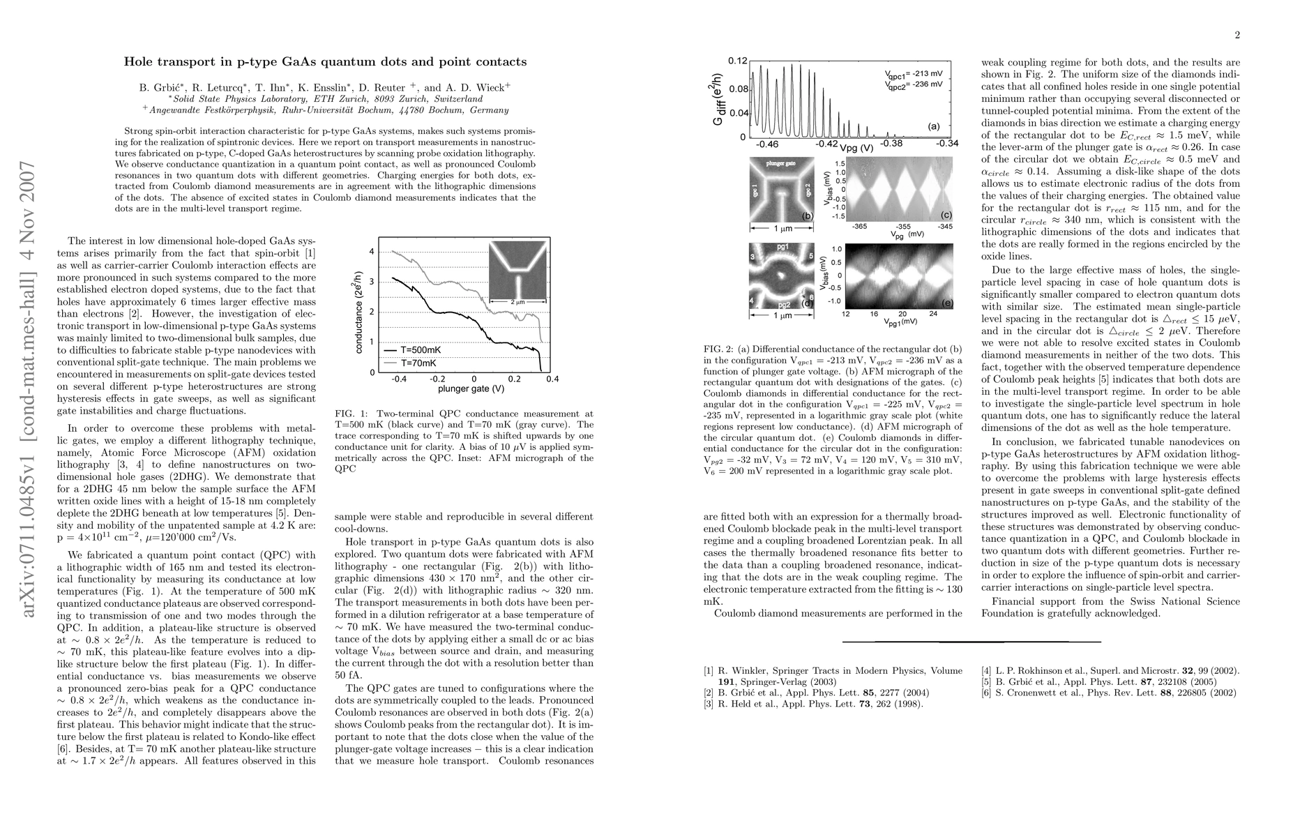 This paper investigates hole transport in p-type GaAs quantum dots and point contacts, revealing conductance quantization and Coulomb resonances. The study confirms the dots' multi-level transport regime and aligns charging energies with lithographic dimensions, highlighting the potential for spintronic applications.
