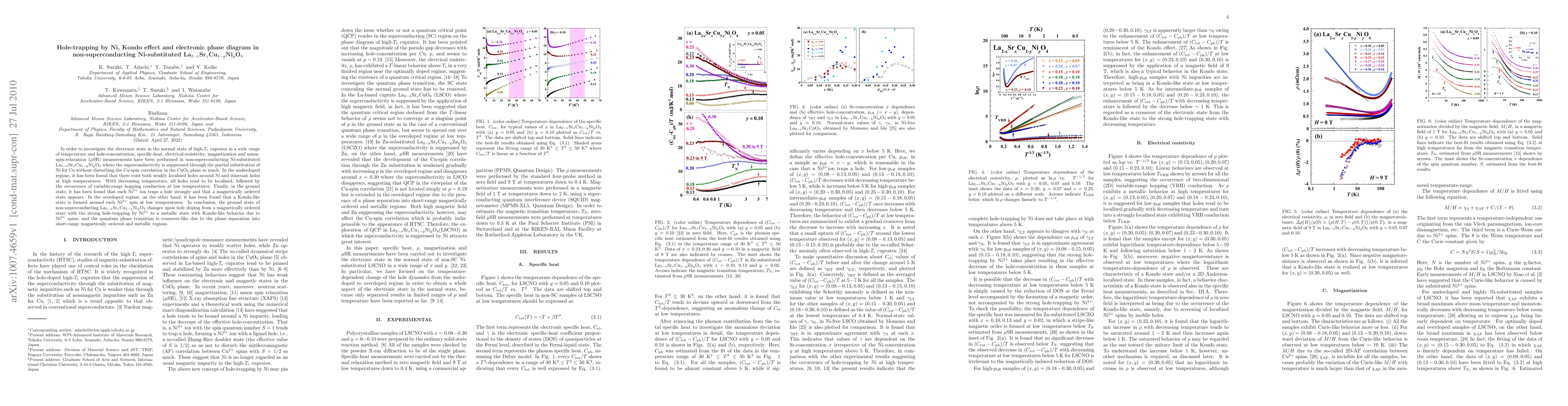In order to investigate the electronic state in the normal state of high-Tc cuprates in a wide range of temperature and hole-concentration, specific-heat, electrical-resistivity, magnetization and muon-spin-relaxation (muSR) measurements have been performed in non-superconducting Ni-substituted La2-xSrxCu1-yNiyO4 where the superconductivity is suppressed through the partial substitution of Ni for Cu without disturbing the Cu-spin correlation in the CuO2 plane so much. In the underdoped regime, it has been found that there exist both weakly localized holes around Ni and itinerant holes at high temperatures. With decreasing temperature, all holes tend to be localized, followed by the occurrence of variable-range hopping conduction at low temperatures. Finally, in the ground state, it has been found that each Ni2+ ion traps a hole strongly and that a magnetically ordered state appears. In the overdoped regime, on the other hand, it has been found that a Kondo-like state is formed around each Ni2+ spin at low temperatures. In conclusion, the ground state of non-superconducting La2-xSrxCu1-yNiyO4 changes upon hole doping from a magnetically ordered state with the strong hole-trapping by Ni2+ to a metallic state with Kondo-like behavior due to Ni2+ spins, and the quantum phase transition is crossover-like due to the phase separation into short-range magnetically ordered and metallic regions.