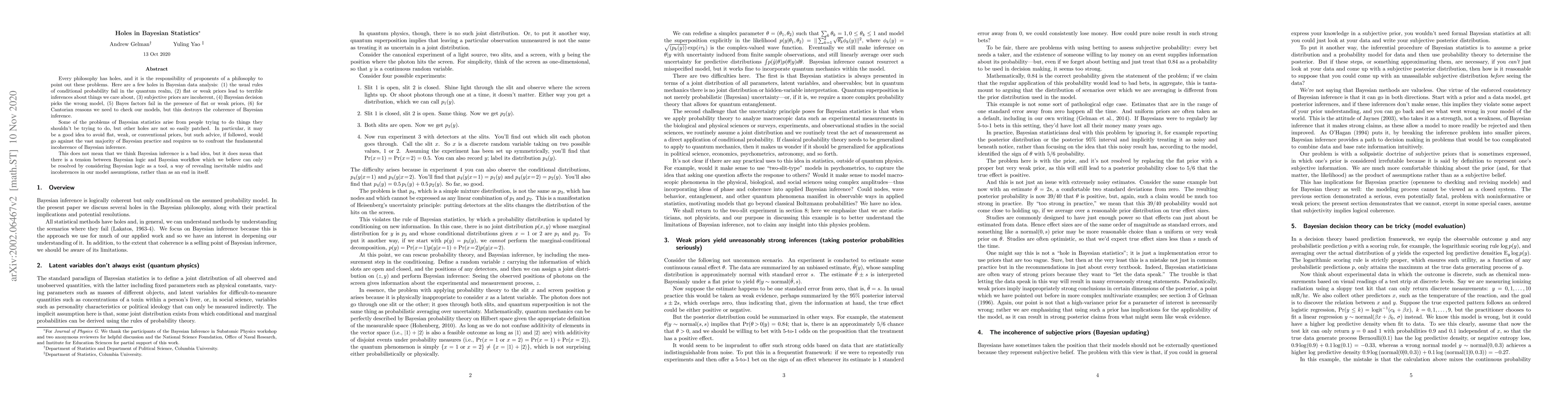 Every philosophy has holes, and it is the responsibility of proponents of a philosophy to point out these problems. Here are a few holes in Bayesian data analysis: (1) the usual rules of conditional probability fail in the quantum realm, (2) flat or weak priors lead to terrible inferences about things we care about, (3) subjective priors are incoherent, (4) Bayesian decision picks the wrong model, (5) Bayes factors fail in the presence of flat or weak priors, (6) for Cantorian reasons we need to check our models, but this destroys the coherence of Bayesian inference. Some of the problems of Bayesian statistics arise from people trying to do things they shouldn't be trying to do, but other holes are not so easily patched. In particular, it may be a good idea to avoid flat, weak, or conventional priors, but such advice, if followed, would go against the vast majority of Bayesian practice and requires us to confront the fundamental incoherence of Bayesian inference. This does not mean that we think Bayesian inference is a bad idea, but it does mean that there is a tension between Bayesian logic and Bayesian workflow which we believe can only be resolved by considering Bayesian logic as a tool, a way of revealing inevitable misfits and incoherences in our model assumptions, rather than as an end in itself.