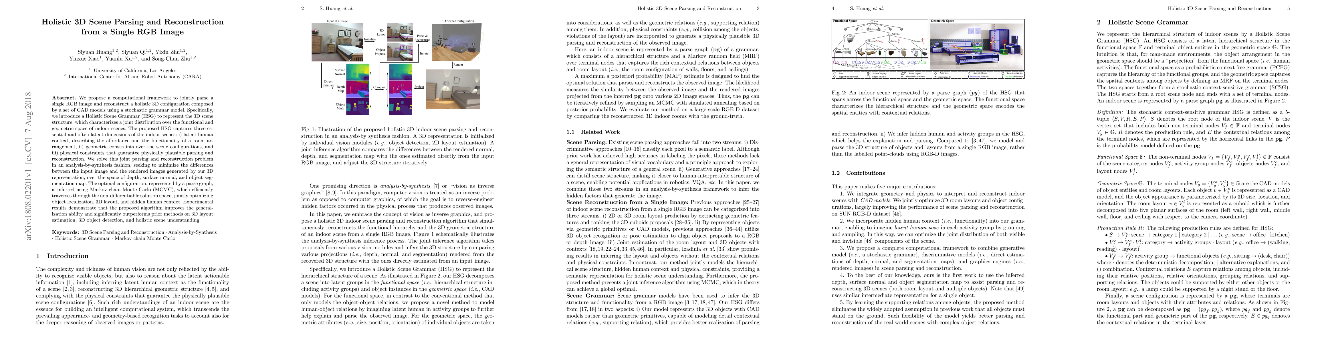 This research proposes a computational framework to parse and reconstruct a 3D configuration from a single RGB image using a Holistic Scene Grammar (HSG) that captures latent human context, geometric, and physical constraints. The method leverages Markov chain Monte Carlo (MCMC) for optimal configuration inference, demonstrating superior performance in 3D layout estimation, object detection, and scene understanding compared to prior methods.