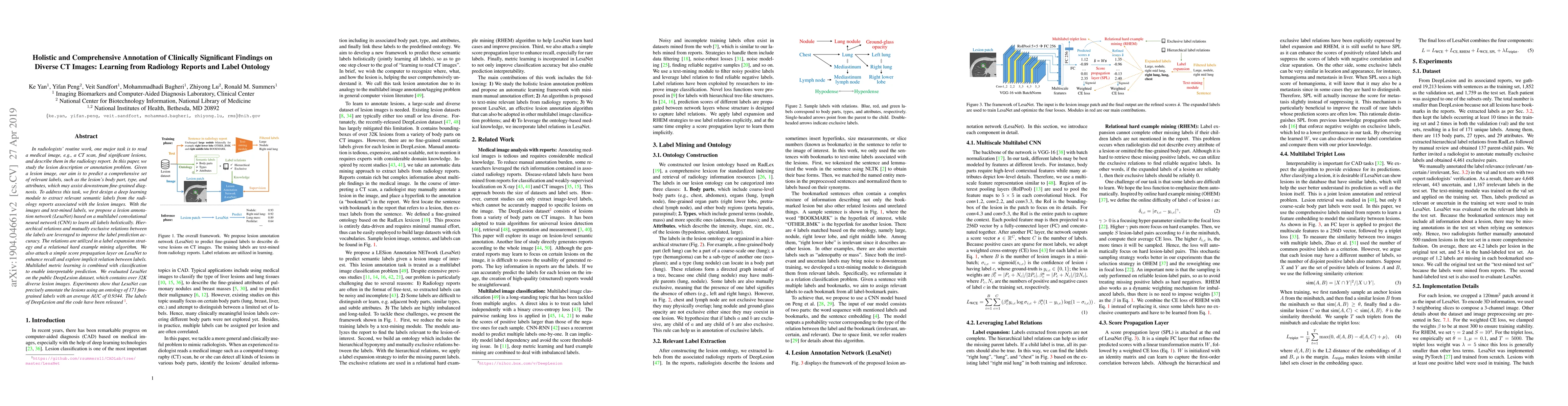 In radiologists' routine work, one major task is to read a medical image, e.g., a CT scan, find significant lesions, and describe them in the radiology report. In this paper, we study the lesion description or annotation problem. Given a lesion image, our aim is to predict a comprehensive set of relevant labels, such as the lesion's body part, type, and attributes, which may assist downstream fine-grained diagnosis. To address this task, we first design a deep learning module to extract relevant semantic labels from the radiology reports associated with the lesion images. With the images and text-mined labels, we propose a lesion annotation network (LesaNet) based on a multilabel convolutional neural network (CNN) to learn all labels holistically. Hierarchical relations and mutually exclusive relations between the labels are leveraged to improve the label prediction accuracy. The relations are utilized in a label expansion strategy and a relational hard example mining algorithm. We also attach a simple score propagation layer on LesaNet to enhance recall and explore implicit relation between labels. Multilabel metric learning is combined with classification to enable interpretable prediction. We evaluated LesaNet on the public DeepLesion dataset, which contains over 32K diverse lesion images. Experiments show that LesaNet can precisely annotate the lesions using an ontology of 171 fine-grained labels with an average AUC of 0.9344.