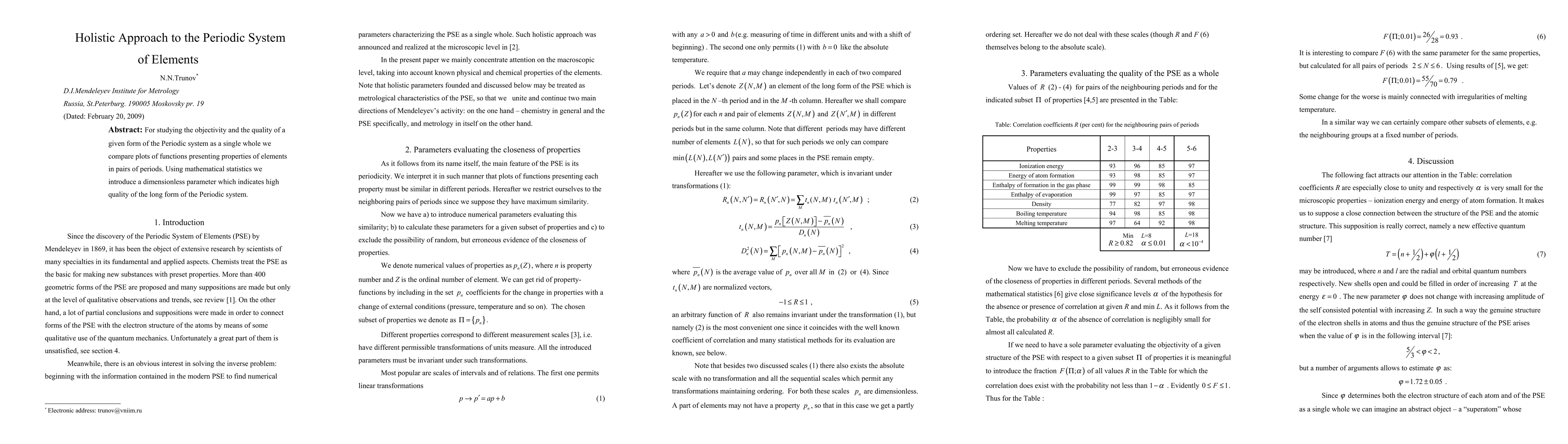 For studying the objectivity and the quality of a given form of the Periodic system as a single whole we compare plots of functions presenting properties of elements in pairs of periods. Using mathematical statistics we introduce a dimensionless parameter which indicates high quality of the long form of the Periodic system.