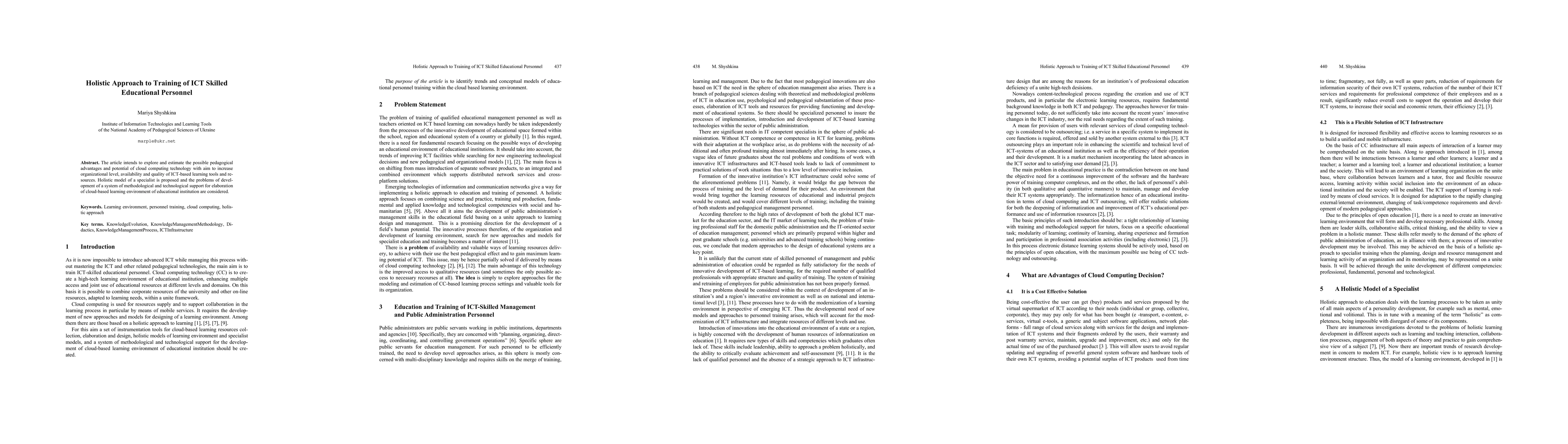 The article intends to explore a nd estimate the possible pedagogical advantages and potential of cloud com puting technology with aim to increase organizational level, availa bility and quality of ICT-ba sed learning tools and re- sources. Holistic model of a specialist is proposed a nd the problems of devel- opment of a system of methodological a nd technological support for elaboration of cloud-based learning environment of educational institution are considered.