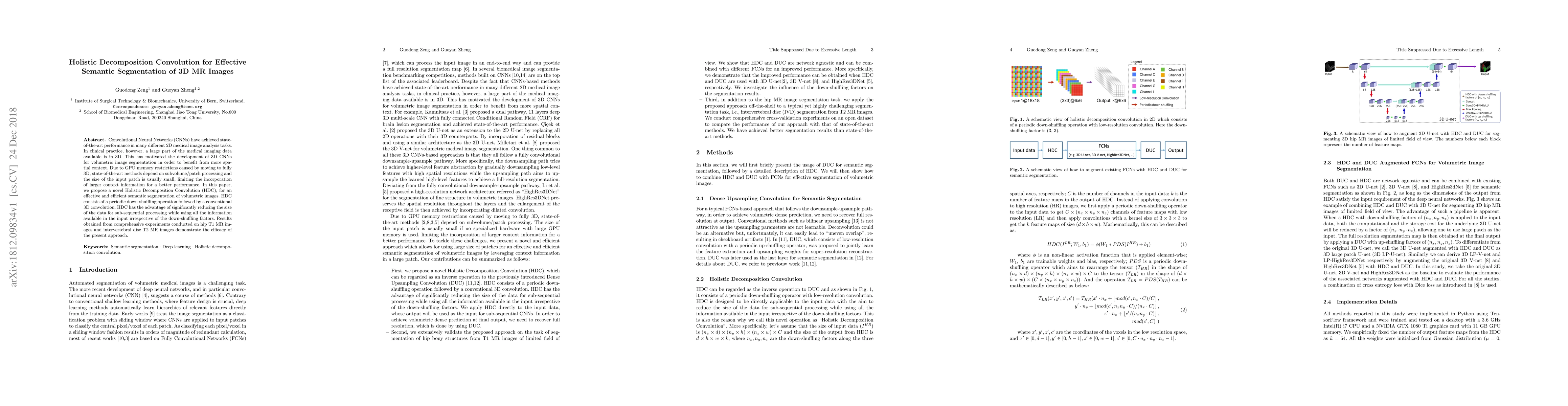 This paper proposes a Holistic Decomposition Convolution (HDC) method to enhance 3D convolutional neural networks for semantic segmentation of volumetric MRI images. HDC reduces data size for efficient processing while retaining all input information, improving segmentation performance.