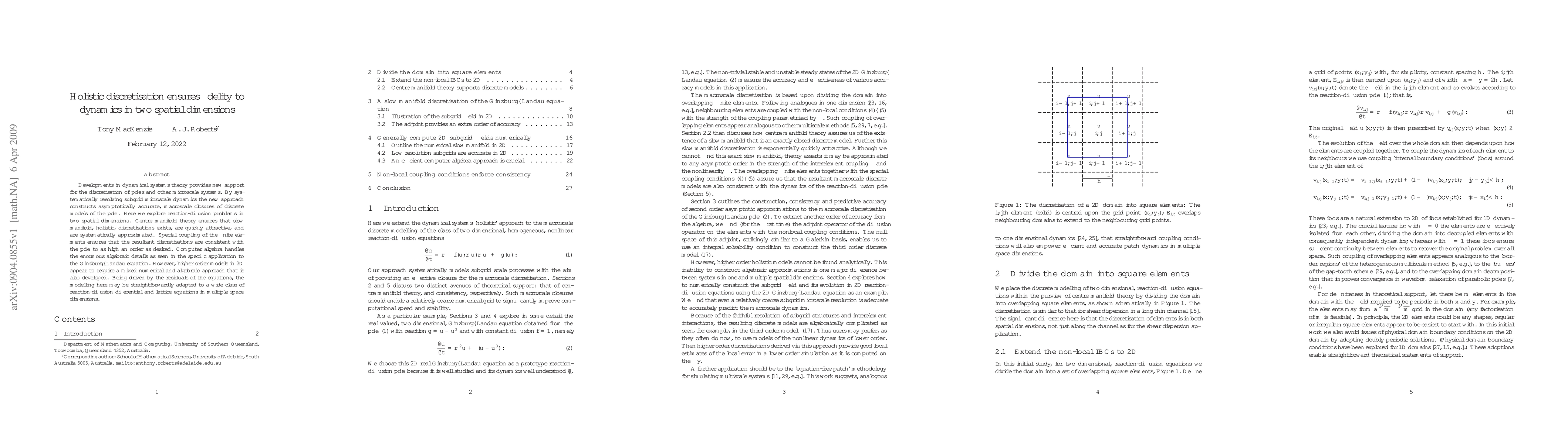 Developments in dynamical systems theory provides new support for the discretisation of \pde{}s and other microscale systems. By systematically resolving subgrid microscale dynamics the new approach constructs asymptotically accurate, macroscale closures of discrete models of the \pde. Here we explore reaction-diffusion problems in two spatial dimensions. Centre manifold theory ensures that slow manifold, holistic, discretisations exists, are quickly attractive, and are systematically approximated. Special coupling of the finite elements ensures that the resultant discretisations are consistent with the \pde to as high an order as desired. Computer algebra handles the enormous algebraic details as seen in the specific application to the Ginzburg--Landau equation. However, higher order models in 2D appear to require a mixed numerical and algebraic approach that is also developed. Being driven by the residuals of the equations, the modelling here may be straightforwardly adapted to a wide class of reaction-diffusion differential and lattice equations in multiple space dimensions.