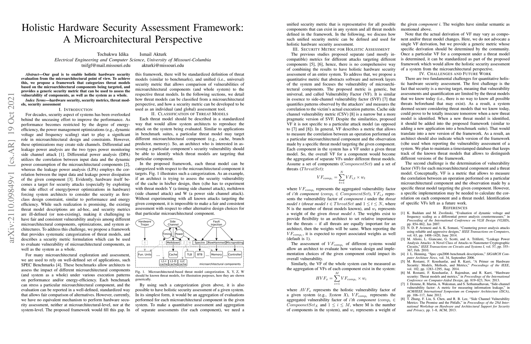 Our goal is to enable holistic hardware security evaluation from the microarchitectural point of view. To achieve this, we propose a framework that categorizes threat models based on the microarchitectural components being targeted, and provides a generic security metric that can be used to assess the vulnerability of components, as well as the system as a whole.