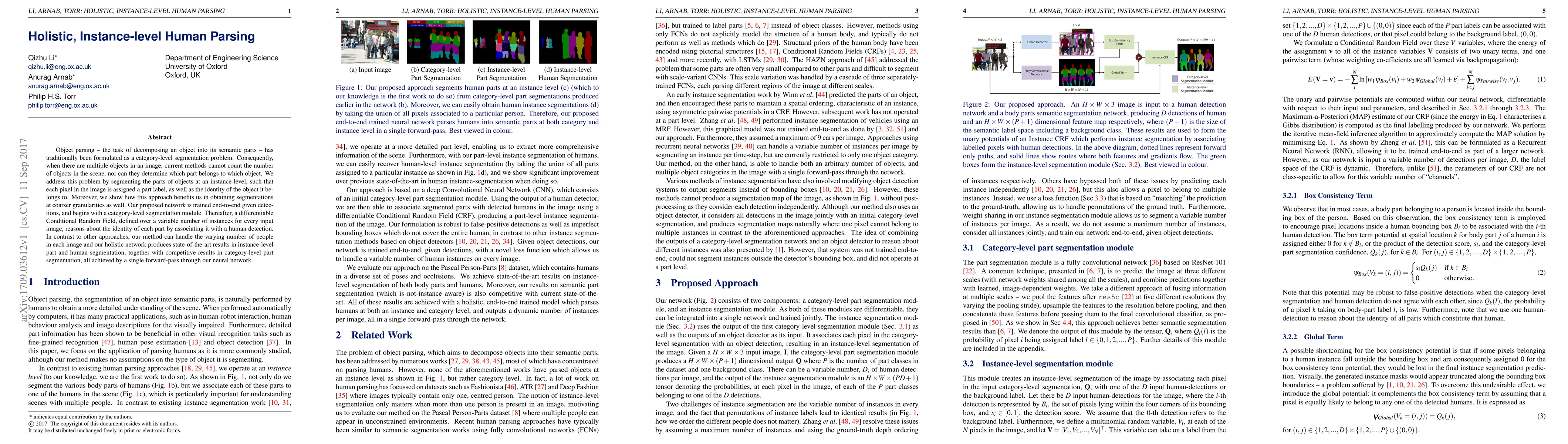 Object parsing -- the task of decomposing an object into its semantic parts -- has traditionally been formulated as a category-level segmentation problem. Consequently, when there are multiple objects in an image, current methods cannot count the number of objects in the scene, nor can they determine which part belongs to which object. We address this problem by segmenting the parts of objects at an instance-level, such that each pixel in the image is assigned a part label, as well as the identity of the object it belongs to. Moreover, we show how this approach benefits us in obtaining segmentations at coarser granularities as well. Our proposed network is trained end-to-end given detections, and begins with a category-level segmentation module. Thereafter, a differentiable Conditional Random Field, defined over a variable number of instances for every input image, reasons about the identity of each part by associating it with a human detection. In contrast to other approaches, our method can handle the varying number of people in each image and our holistic network produces state-of-the-art results in instance-level part and human segmentation, together with competitive results in category-level part segmentation, all achieved by a single forward-pass through our neural network.
