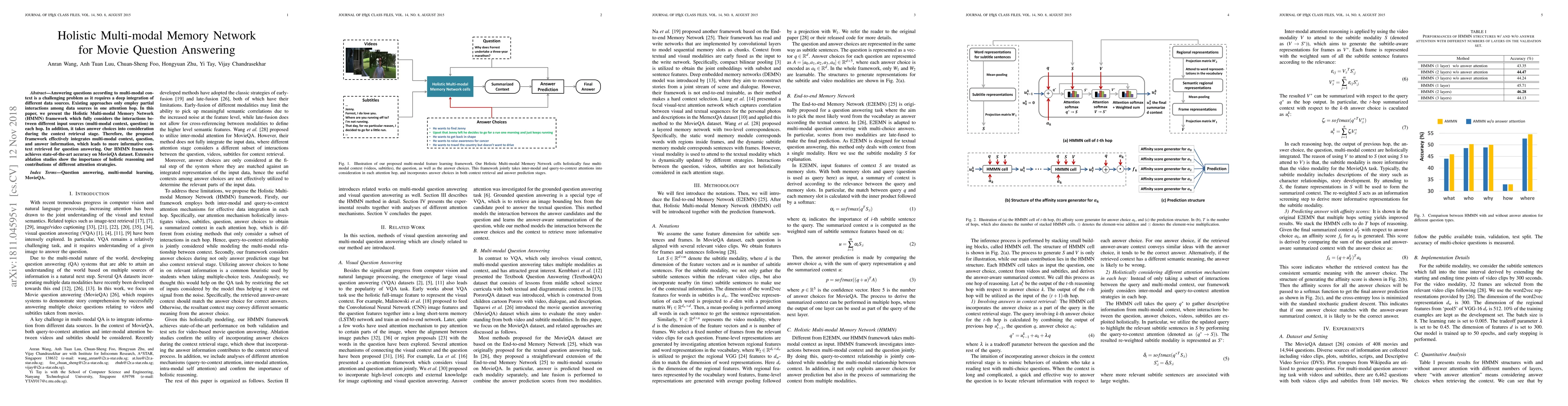 This paper introduces the Holistic Multi-modal Memory Network (HMMN) framework to improve movie question answering by fully integrating interactions among multi-modal context, questions, and answer choices. The proposed framework achieves state-of-the-art accuracy on the MovieQA dataset, demonstrating the benefits of holistic reasoning and various attention strategies.