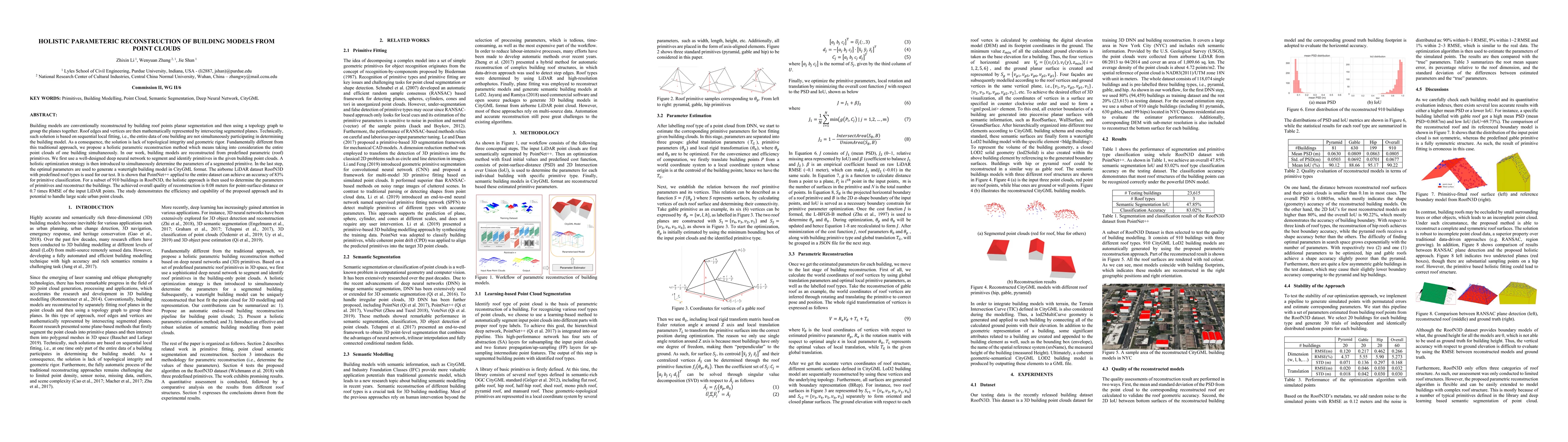 This paper proposes a holistic parametric reconstruction method for building models from point clouds, contrasting traditional sequential local fitting approaches. The method uses a deep neural network to identify primitives and a holistic optimization strategy to simultaneously determine their parameters, achieving an overall reconstruction quality of 0.08 meters.