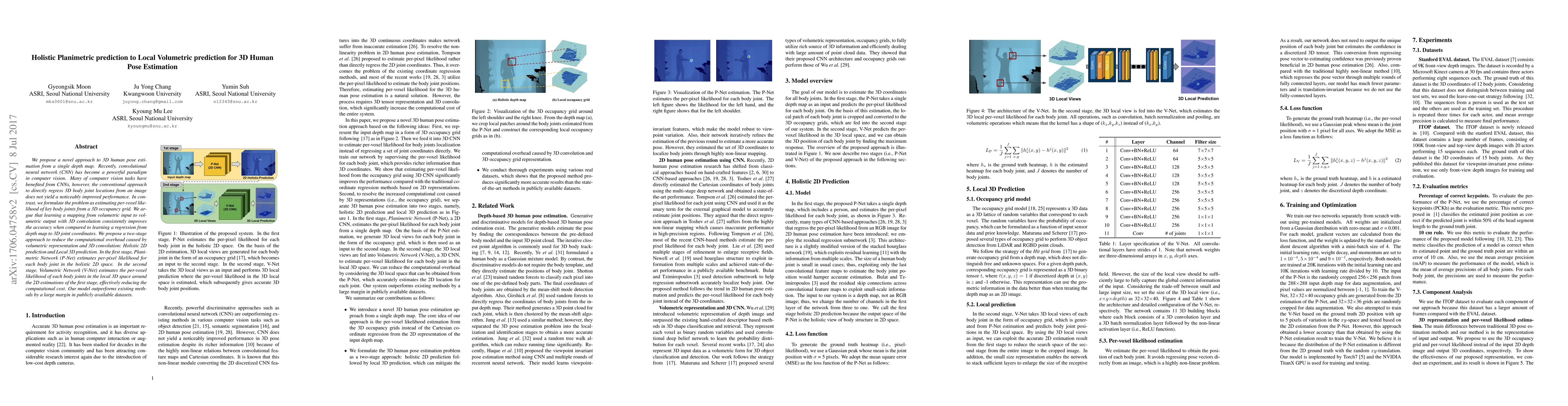 This paper proposes a two-stage approach for 3D human pose estimation from a single depth map, utilizing a Planimetric Network (P-Net) for holistic 2D prediction and a Volumetric Network (V-Net) for local 3D prediction. The method estimates per-voxel likelihood of key body joints from a 3D occupancy grid, outperforming existing regression-based methods.