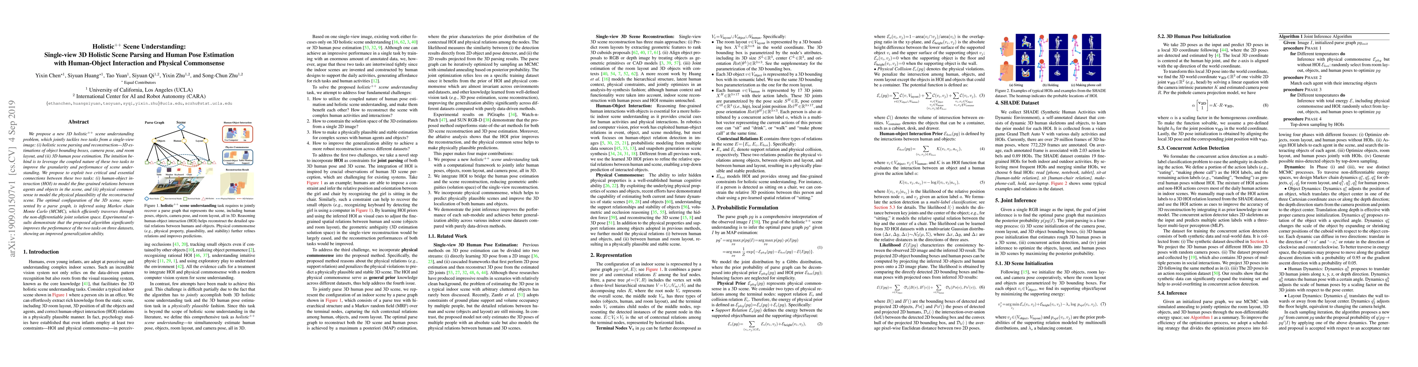 This paper introduces a new 3D holistic++ scene understanding framework that jointly performs single-view 3D scene parsing and 3D human pose estimation, leveraging human-object interactions and physical commonsense to enhance performance. The method uses Markov chain Monte Carlo for inference and shows improved results on three datasets.