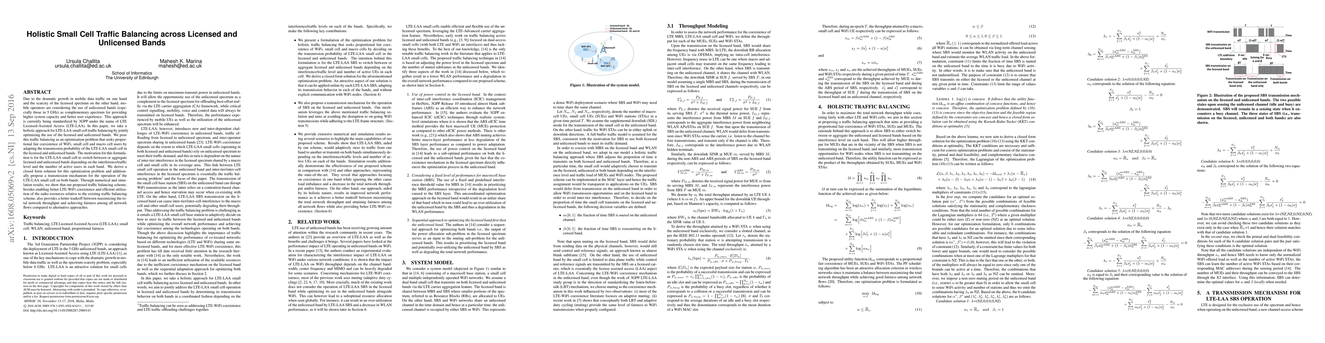 This paper proposes a holistic traffic balancing scheme for LTE-LAA small cells that optimizes the use of both licensed and unlicensed spectrum bands, aiming for proportional fair coexistence among WiFi, small cell, and macro cell users. The authors derive a closed-form solution and a transmission mechanism, demonstrating improved network throughput and fairness compared to existing methods.
