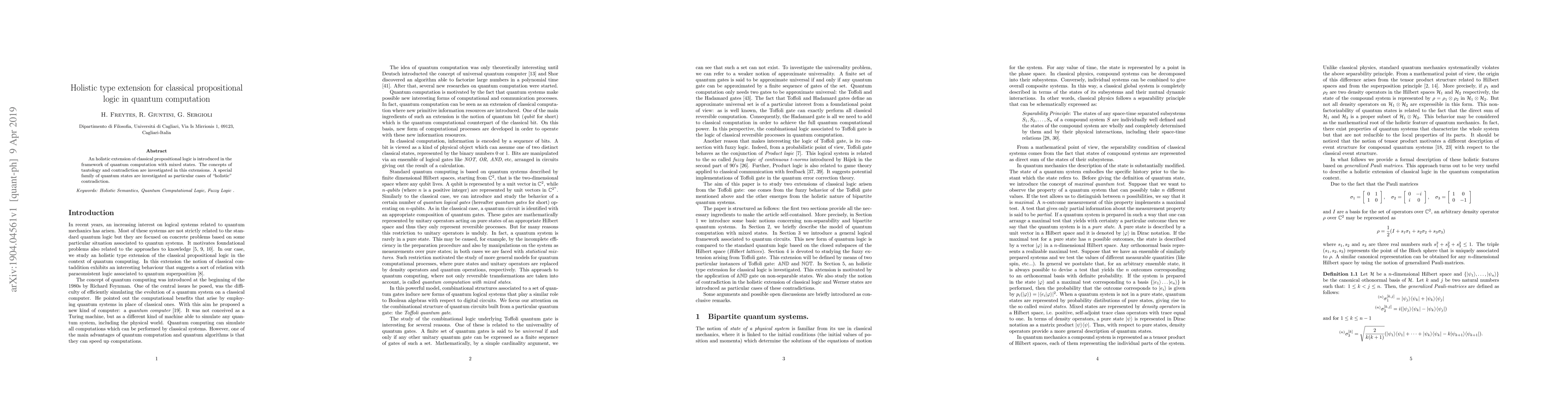 A holistic extension of classical propositional logic is introduced in the framework of quantum computation with mixed states. The concepts of tautology and contradiction are investigated in this extensions. A special family of quantum states are investigated as particular cases of "holistic" contradiction.