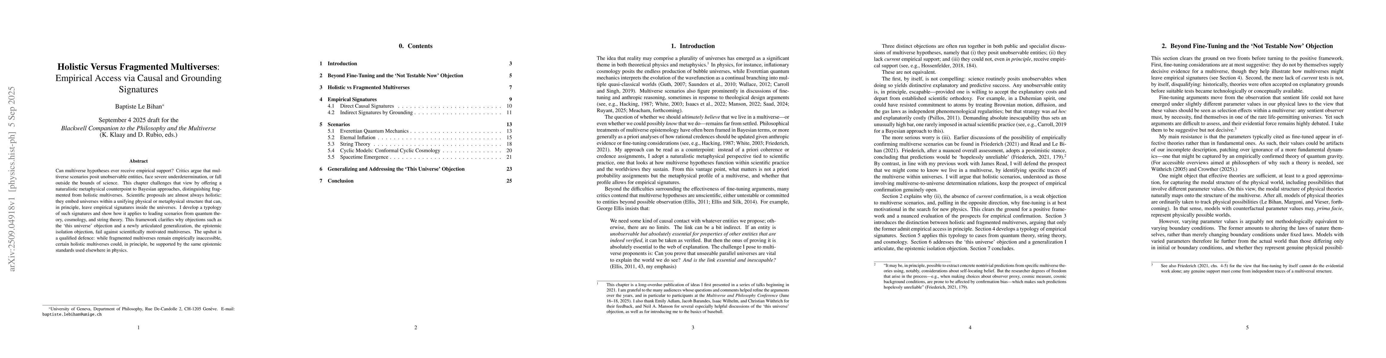 Can multiverse hypotheses ever receive empirical support? Critics argue that multiverse scenarios posit unobservable entities, face severe underdetermination, or fall outside the bounds of science. This chapter challenges that view by offering a naturalistic metaphysical counterpoint to Bayesian approaches, distinguishing fragmented from holistic multiverses. Scientific proposals are almost always holistic: they embed universes within a unifying physical or metaphysical structure that can, in principle, leave empirical signatures inside the universes. I develop a typology of such signatures and show how it applies to leading scenarios from quantum theory, cosmology, and string theory. This framework clarifies why objections such as the `this universe' objection and a newly articulated generalization, the epistemic isolation objection, fail against scientifically motivated multiverses. The upshot is a qualified defence: while fragmented multiverses remain empirically inaccessible, certain holistic multiverses could, in principle, be supported by the same epistemic standards used elsewhere in physics.