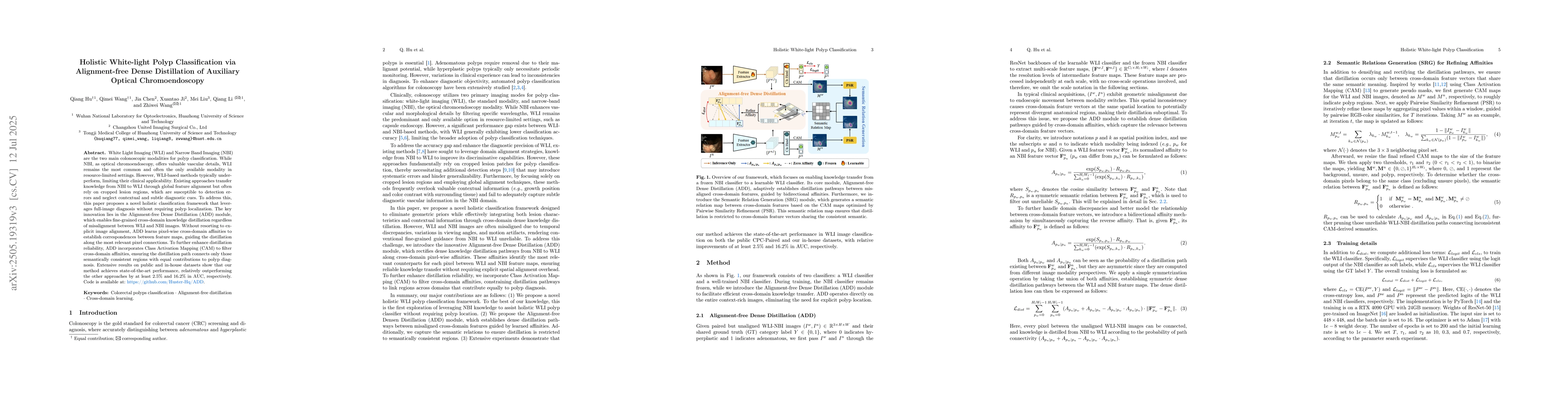 The research proposes a holistic white-light polyp classification framework that leverages full-image diagnosis without requiring polyp localization. It introduces the Alignment-free Dense Distillation (ADD) module to enable fine-grained cross-domain knowledge distillation, regardless of misalignment between WLI and NBI images.