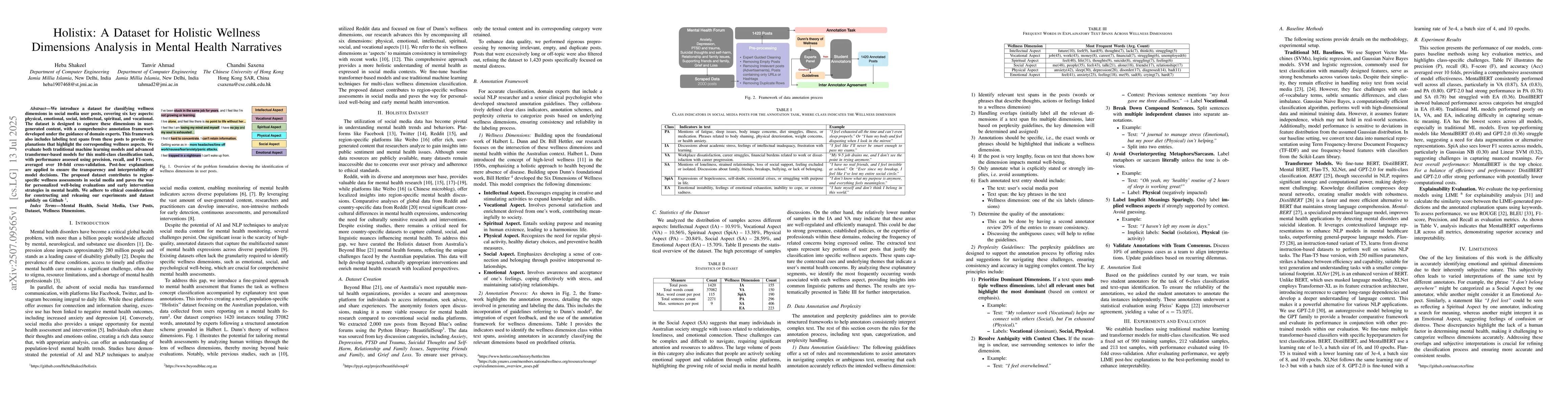 We introduce a dataset for classifying wellness dimensions in social media user posts, covering six key aspects: physical, emotional, social, intellectual, spiritual, and vocational. The dataset is designed to capture these dimensions in user-generated content, with a comprehensive annotation framework developed under the guidance of domain experts. This framework allows for the classification of text spans into the appropriate wellness categories. We evaluate both traditional machine learning models and advanced transformer-based models for this multi-class classification task, with performance assessed using precision, recall, and F1-score, averaged over 10-fold cross-validation. Post-hoc explanations are applied to ensure the transparency and interpretability of model decisions. The proposed dataset contributes to region-specific wellness assessments in social media and paves the way for personalized well-being evaluations and early intervention strategies in mental health. We adhere to ethical considerations for constructing and releasing our experiments and dataset publicly on Github.