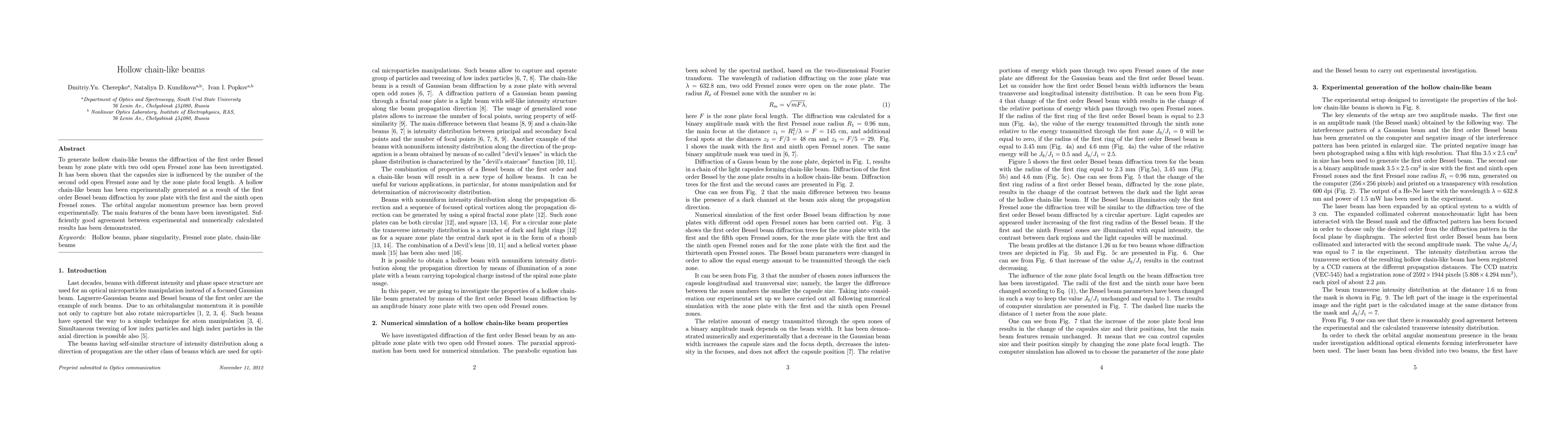 To generate hollow chain-like beams the diffraction of the first order Bessel beam by zone plate with two odd open Fresnel zone has been investigated. It has been shown that the capsules size is influenced by the number of the second odd open Fresnel zone and by the zone plate focal length. A hollow chain-like beam has been experimentally generated as a result of the first order Bessel beam diffraction by zone plate with the first and the ninth open Fresnel zones. The orbital angular momentum presence has been proved experimentally. The main features of the beam have been investigated. Sufficiently good agreement between experimental and numerically calculated results has been demonstrated.