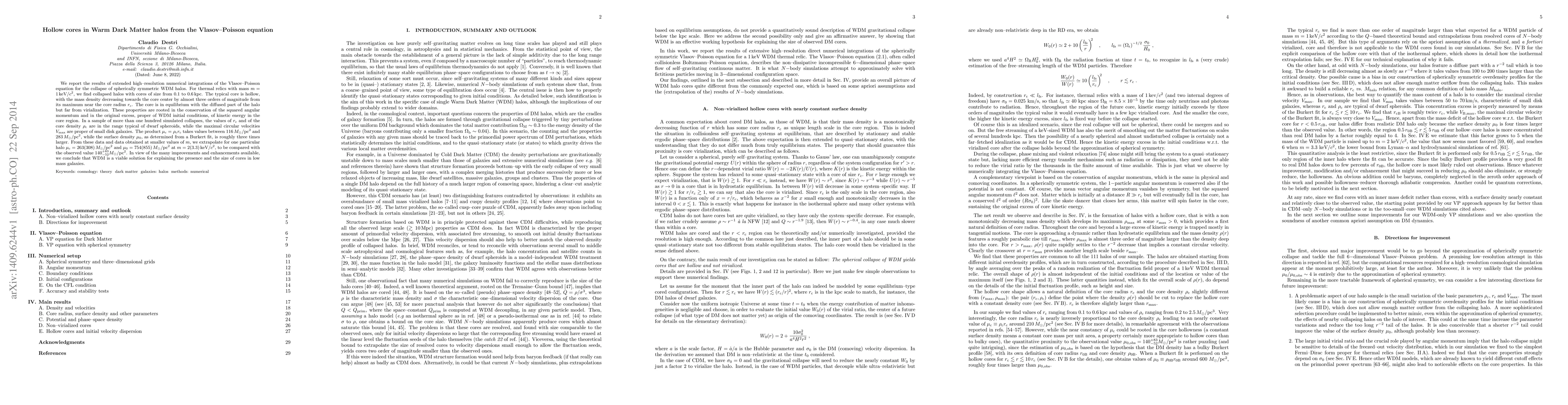 We report the results of extended high--resolution numerical integrations of the Vlasov--Poisson equation for the collapse of spherically symmetric WDM halos. For thermal relics with mass $m=1\,$keV/$c^2$, we find collapsed halos with cores of size from $0.1$ to $0.6\,$kpc. The typical core is hollow, with the mass density decreasing towards the core center by almost three orders of magnitude from its maximum near the core radius $r_{\rm c}$. The core is in equilibrium with the diffused part of the halo but far from virialization. These properties are rooted in the conservation of the squared angular momentum and in the original excess, proper of WDM initial conditions, of kinetic energy in the core region. In a sample of more than one hundred simulated collapses, the values of $r_{\rm c}$ and of the core density $\rho_{\rm c}$ are in the range typical of dwarf spheroids, while the maximal circular velocities $V_{\rm max}$ are proper of small disk galaxies. The product $\mu_{\rm c}=\rho_{\rm c}r_{\rm c}$ takes values between $116\,M_\odot/$pc$^2$ and $283\,M_\odot/$pc$^2$, while the surface density $\mu_0$, as determined from a Burkert fit, is roughly three times larger. From these data and data obtained at smaller values of $m$, we extrapolate for one particular halo $\mu_{\rm c}=263(308)\,M_\odot/$pc$^2$ and $\mu_0=754(855)\,M_\odot/$pc$^2$ at $m=2(3.3)\,$keV/$c^2$, to be compared with the observed value $140^{+83}_{-52} M_\odot$/pc$^2$. In view of the many improvements and enhancements available, we conclude that WDM is a viable solution for explaining the presence and the size of cores in low mass galaxies.