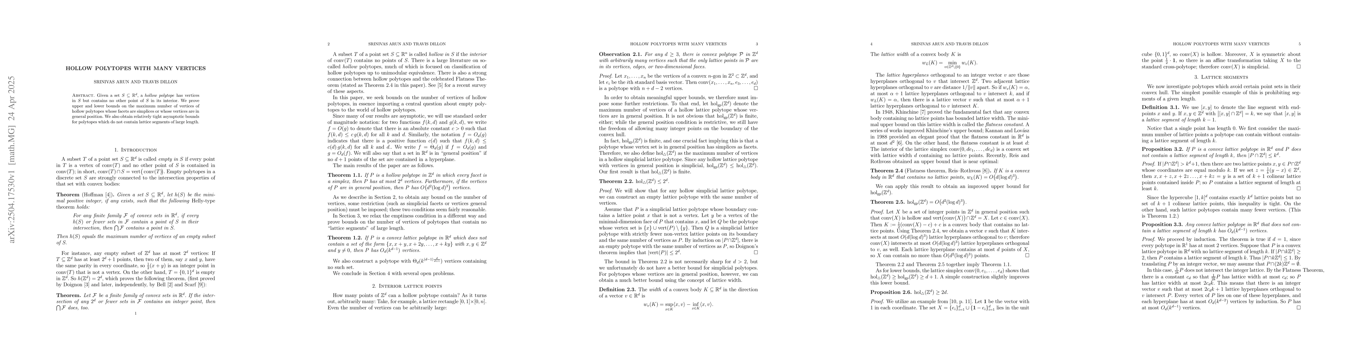 The paper proves upper and lower bounds on the maximum number of vertices of hollow polytopes using methods from combinatorial geometry and lattice point enumeration.